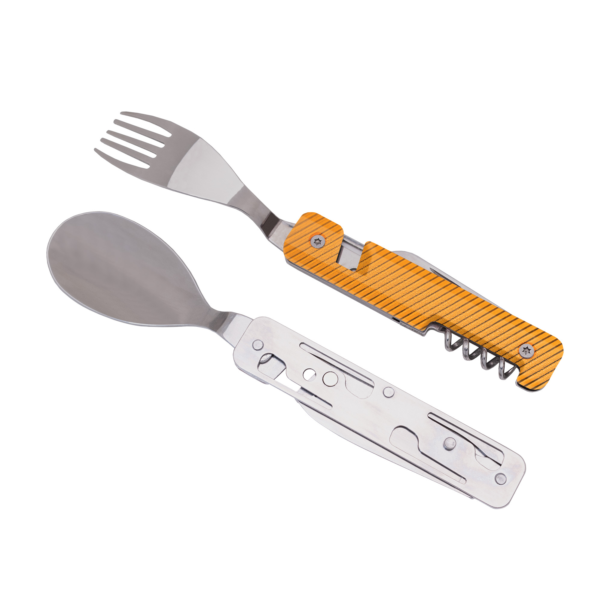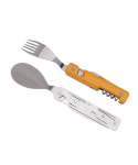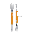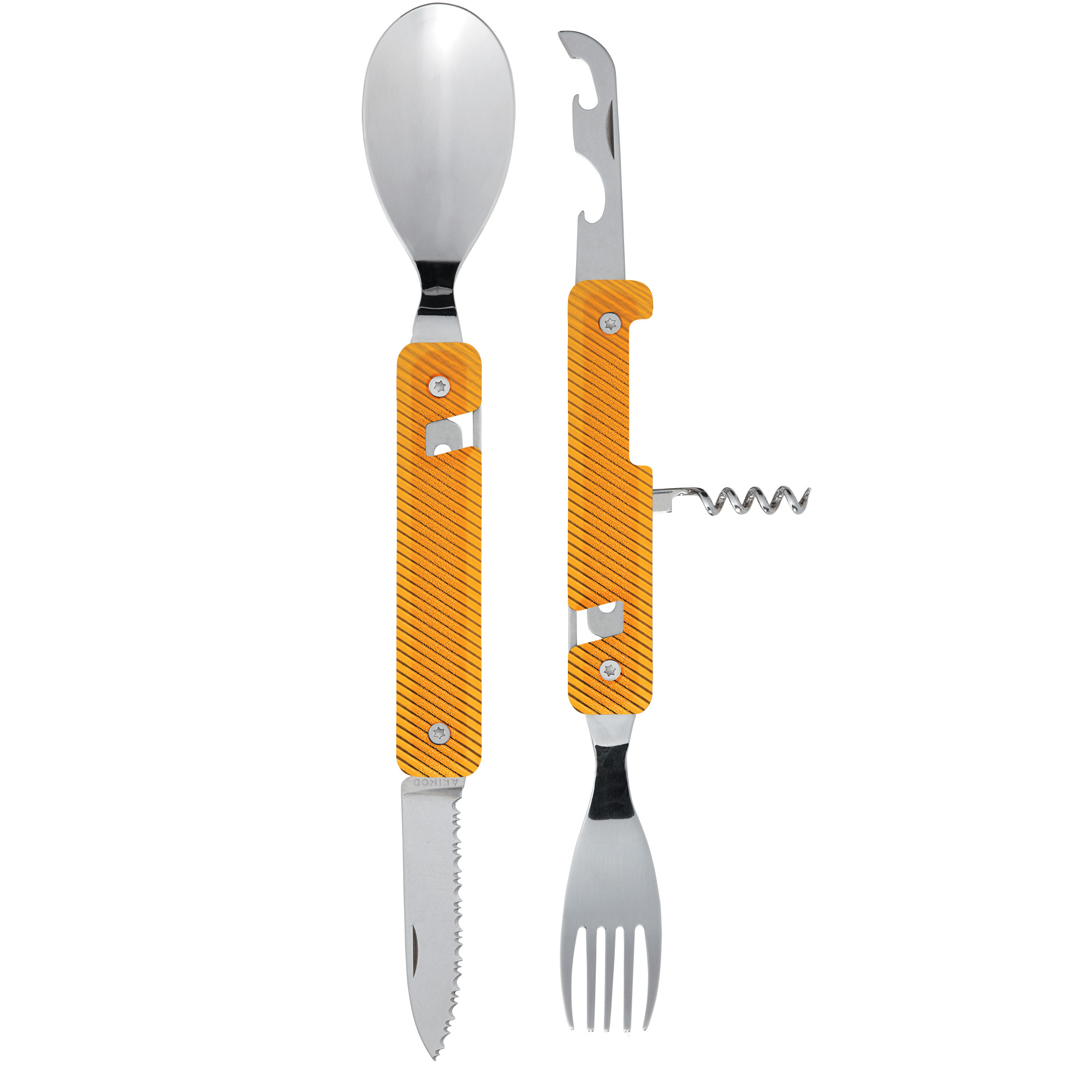 Cestovatelský příborový set v moderním designu s eloxovanou rukojetí oranžové barvy.