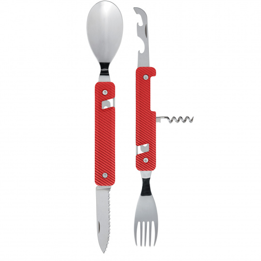 Cestovatelský příborový set v moderním designu s eloxovanou rukojetí sytě rudé barvy.