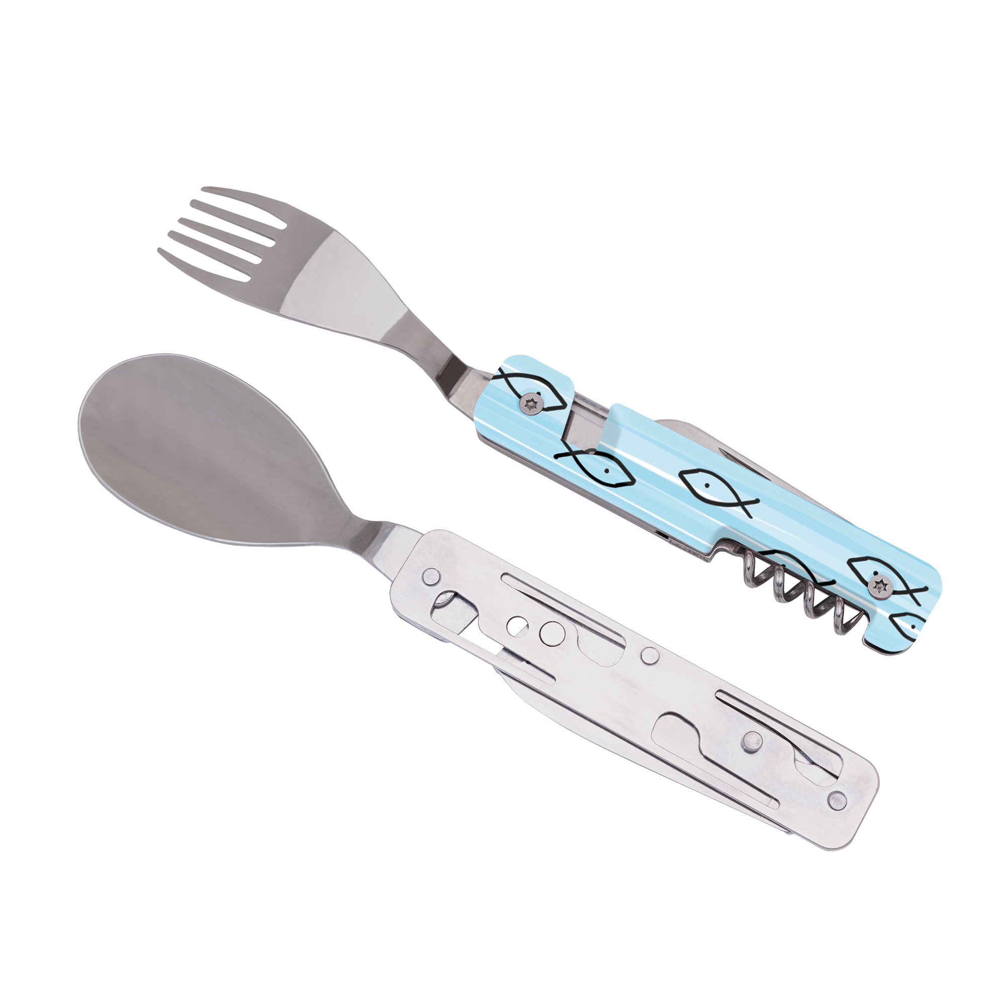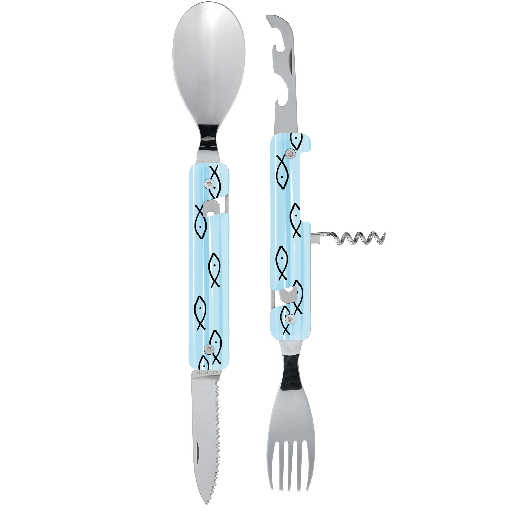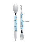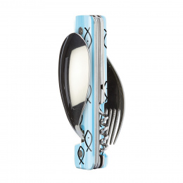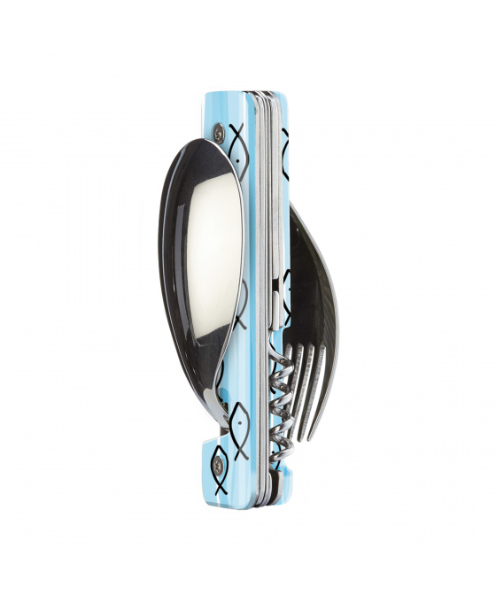 Cestovatelský příborový set s vývrtkou v moderním designu se vzorem mořské rybky - sledě.
