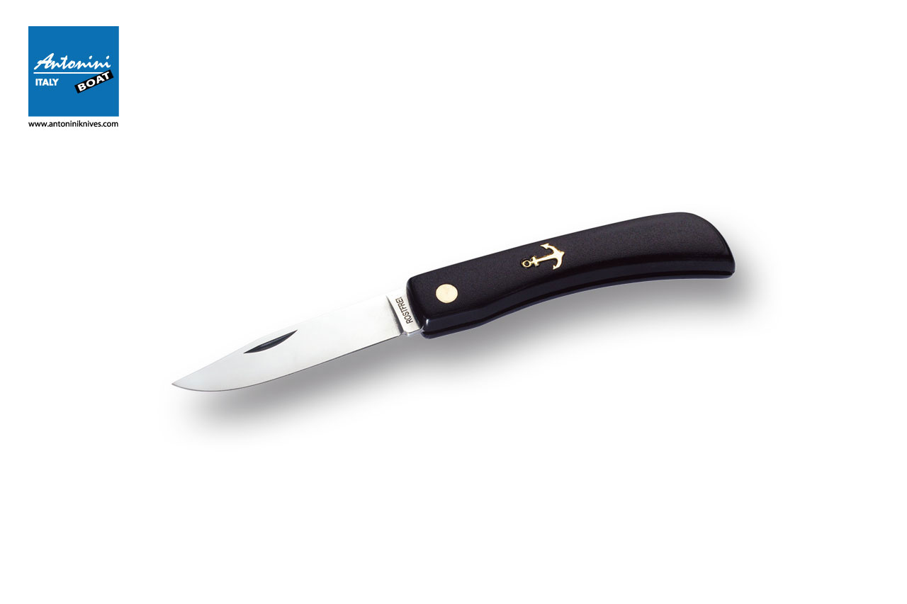 Kapesní nůž z kolekce BOAT-FISHING s čepelí z nerezové oceli, černou plastovou rukojetí zdobenou emblémem kotvy ve stříbrné barvě.