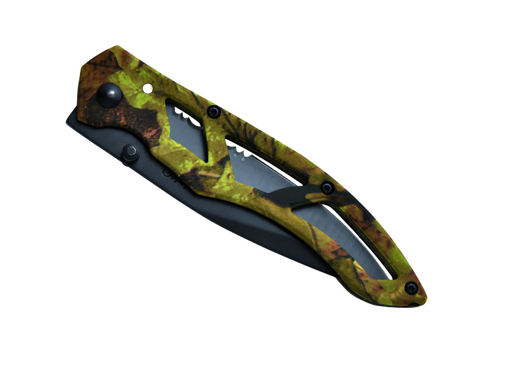 <p>Skládací nůž s čepelí z nerezové oceli, která je částěčně pilovitá. Jednoruční otevírání a