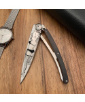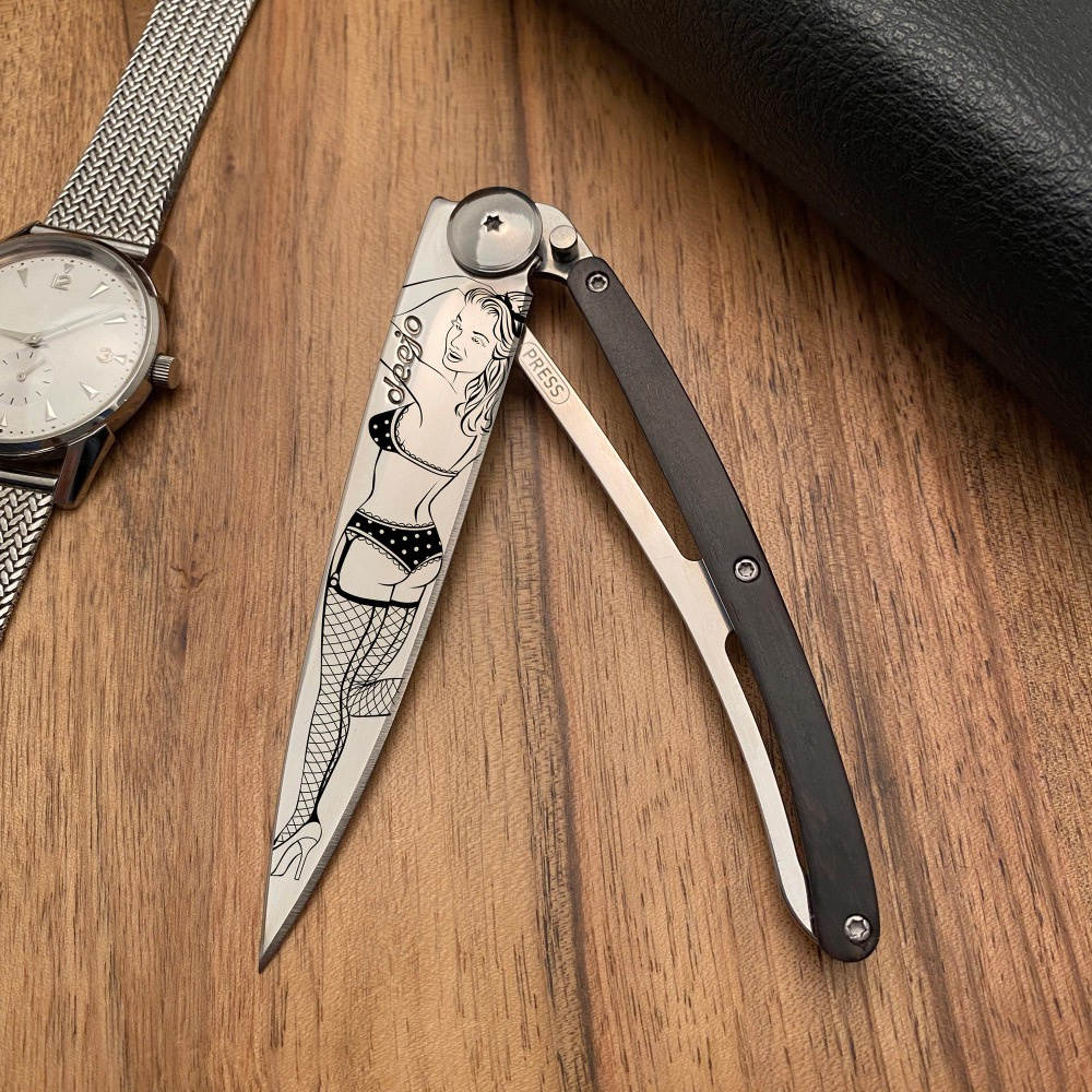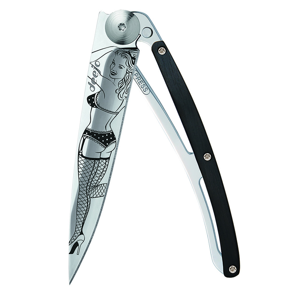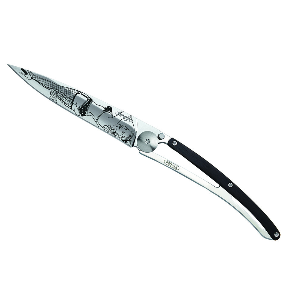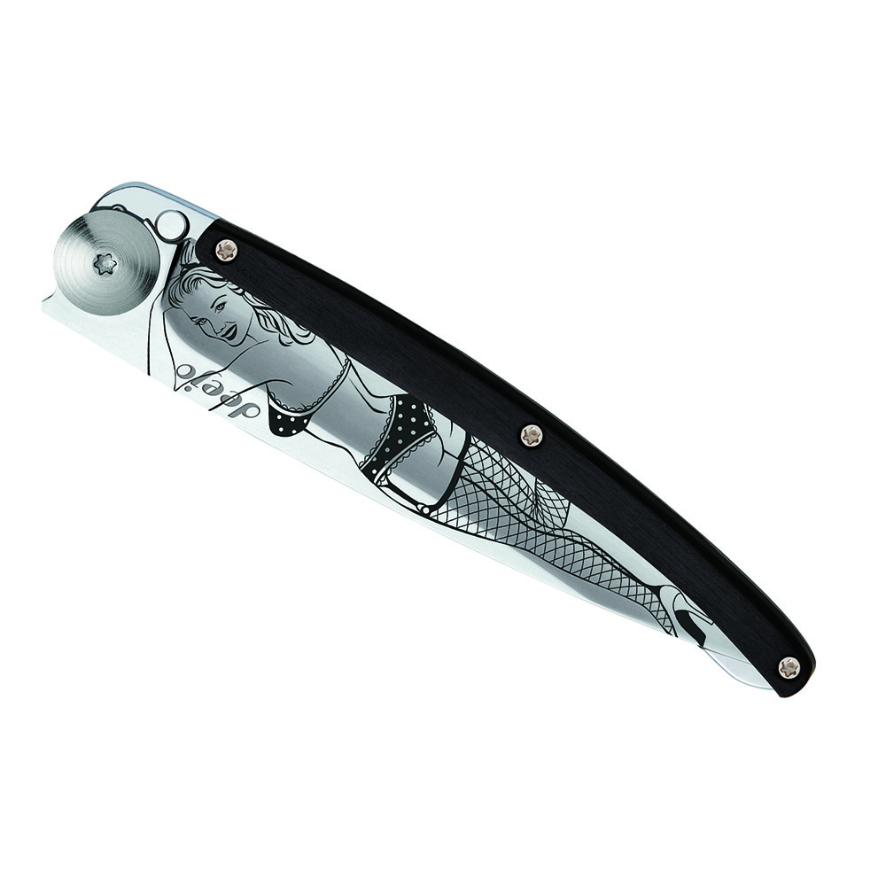 Stylový ultralehký nůž Deejo z kolekce Mirror se střenkou z ebenového dřeva a čepelí s vysokým leskem a tetováním "Pin Up".