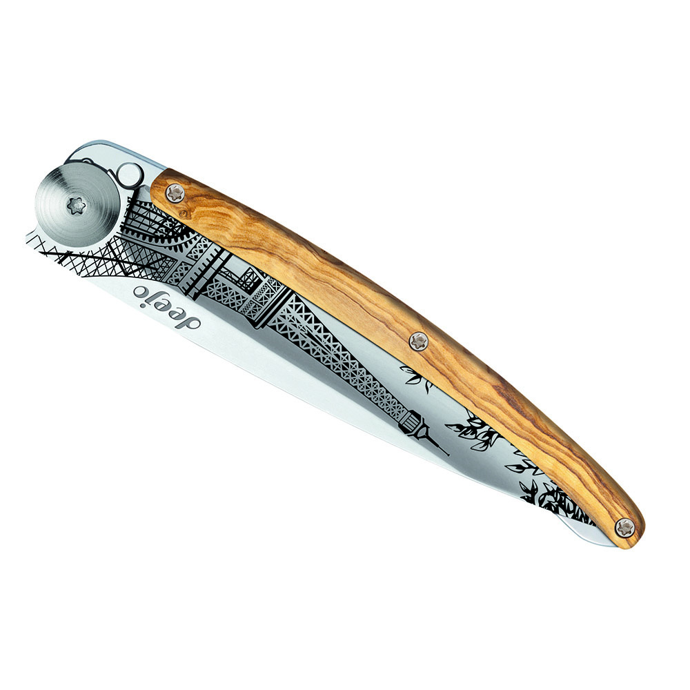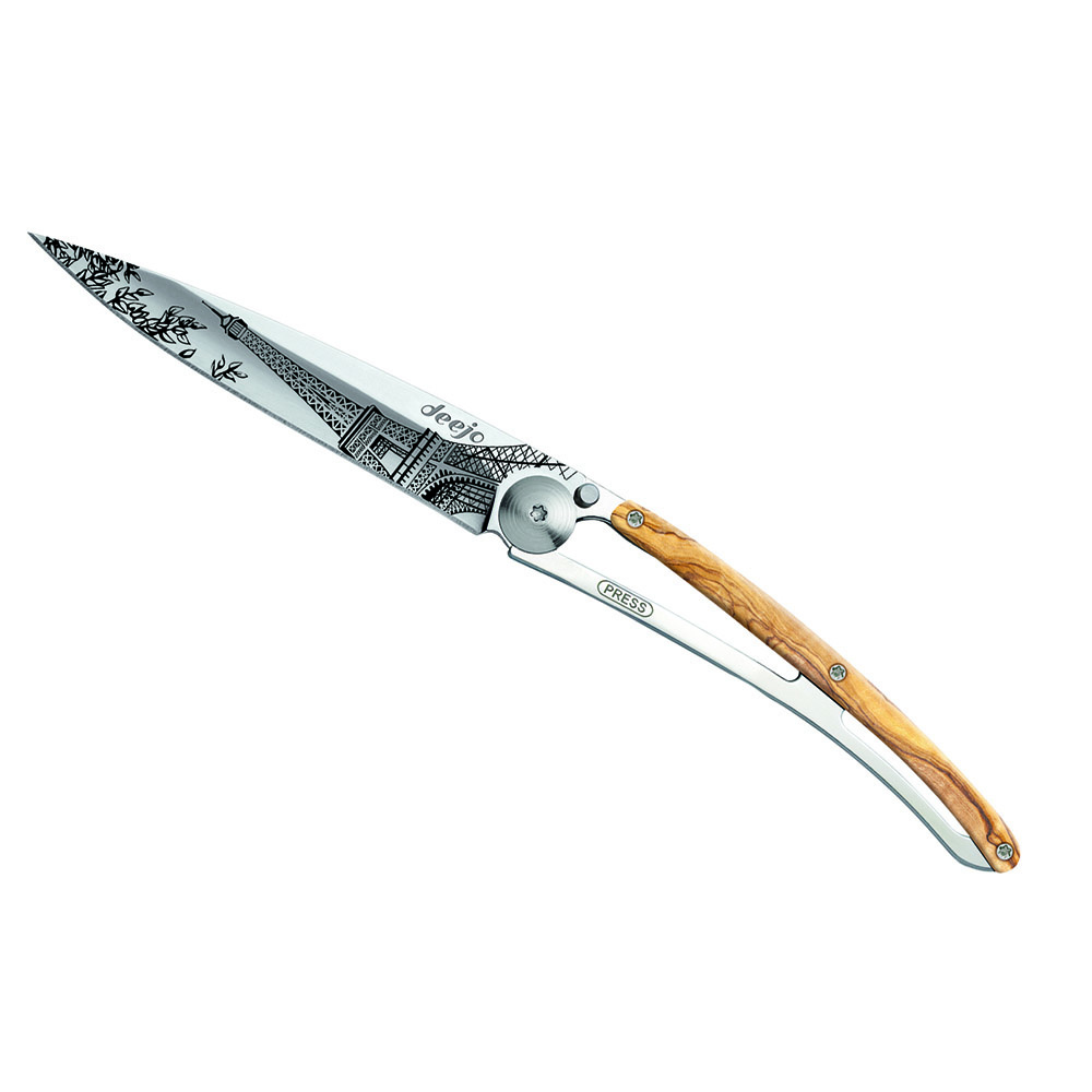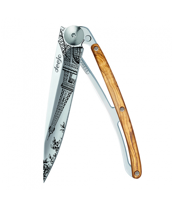 Stylový ultralehký nůž Deejo z kolekce Mirror se střenkou z olivového dřeva a čepelí s vysokým leskem a tetováním "Eiffel Tower".