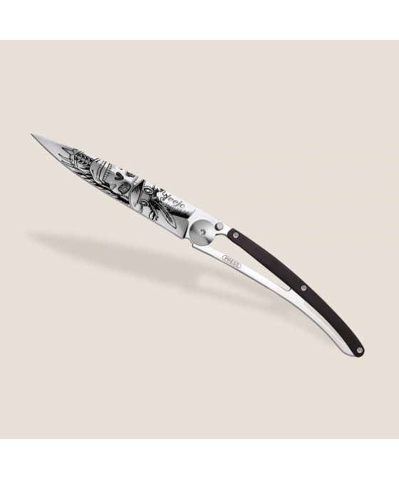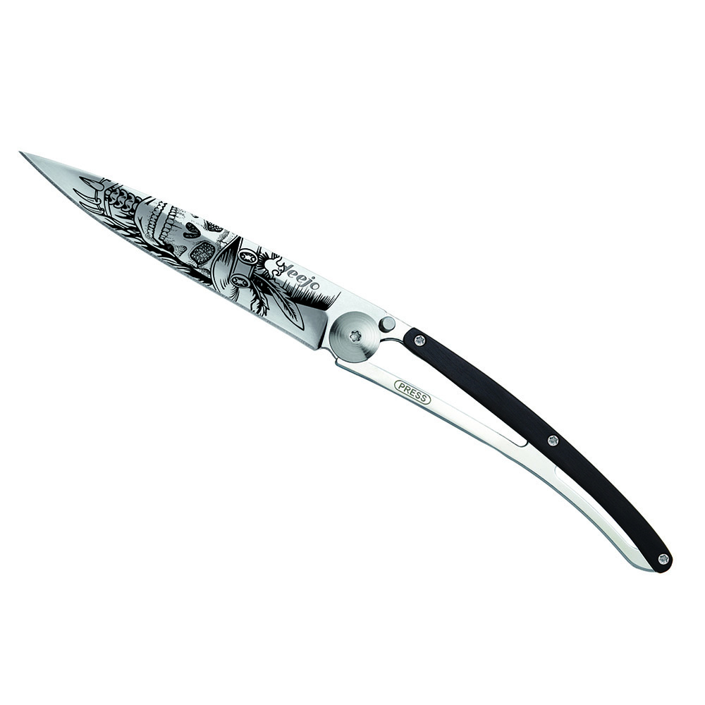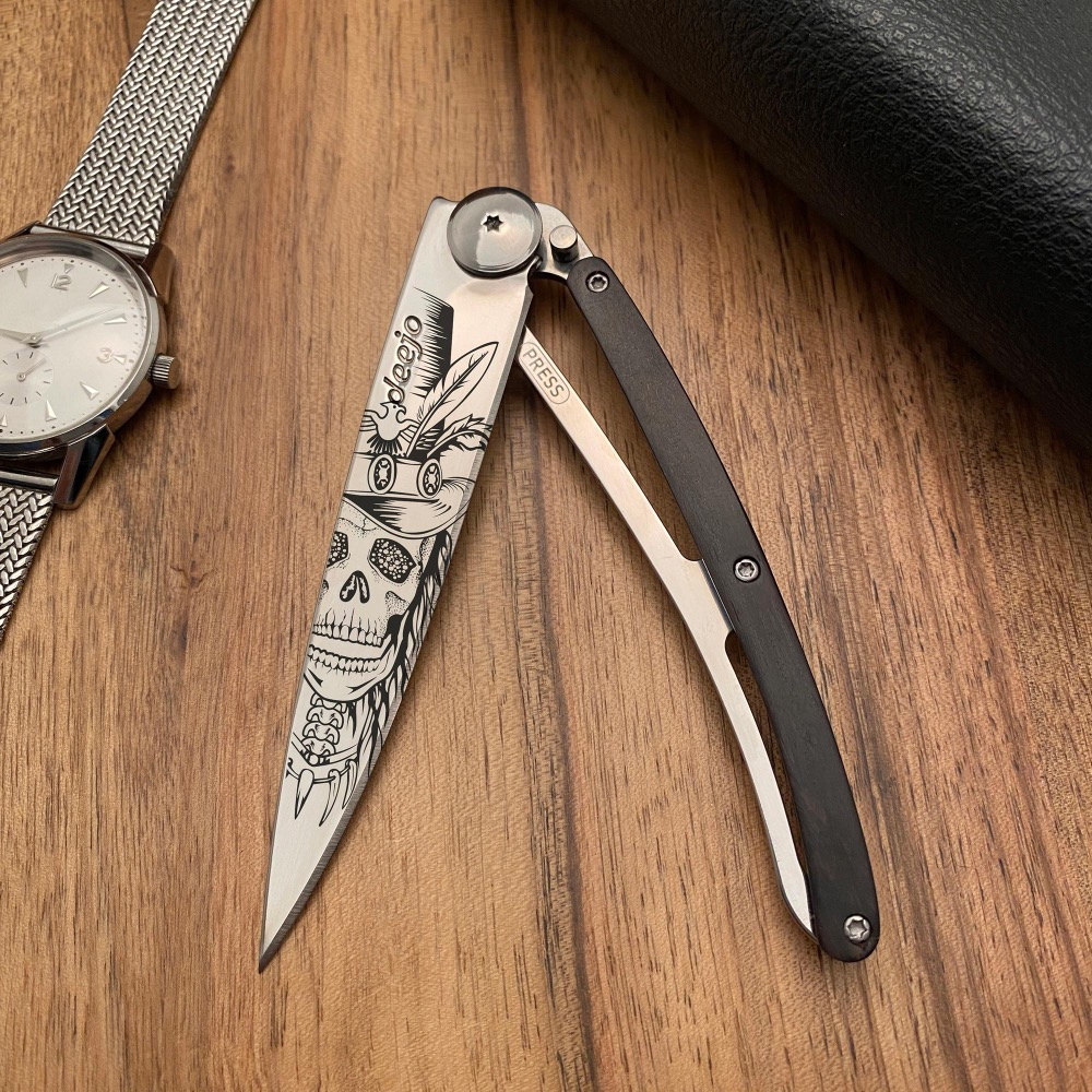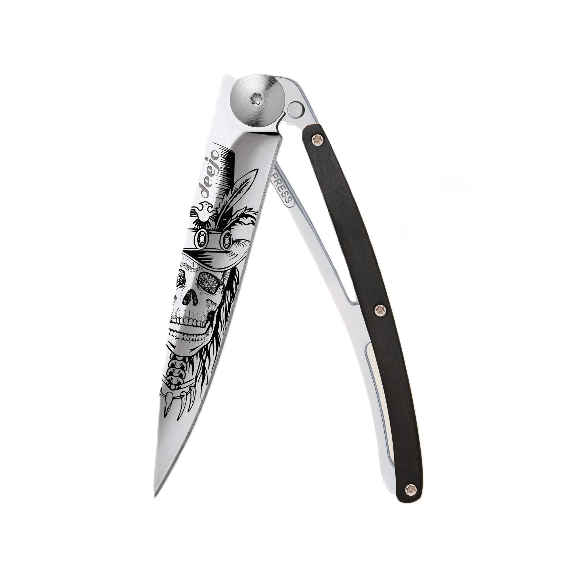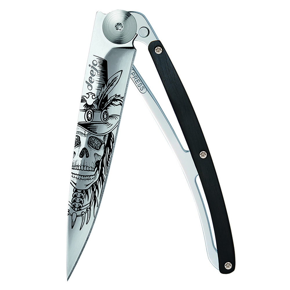 Stylový ultralehký nůž Deejo z kolekce Mirror se střenkou z ebenového dřeva a čepelí s vysokým leskem a tetováním "Dundy Skull".