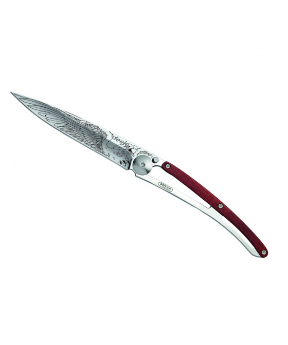 Stylový ultralehký nůž Deejo z kolekce Mirror se střenkou z exotického dřeva coralwood a čepelí s vysokým leskem a tetováním "Eagle".