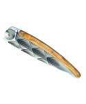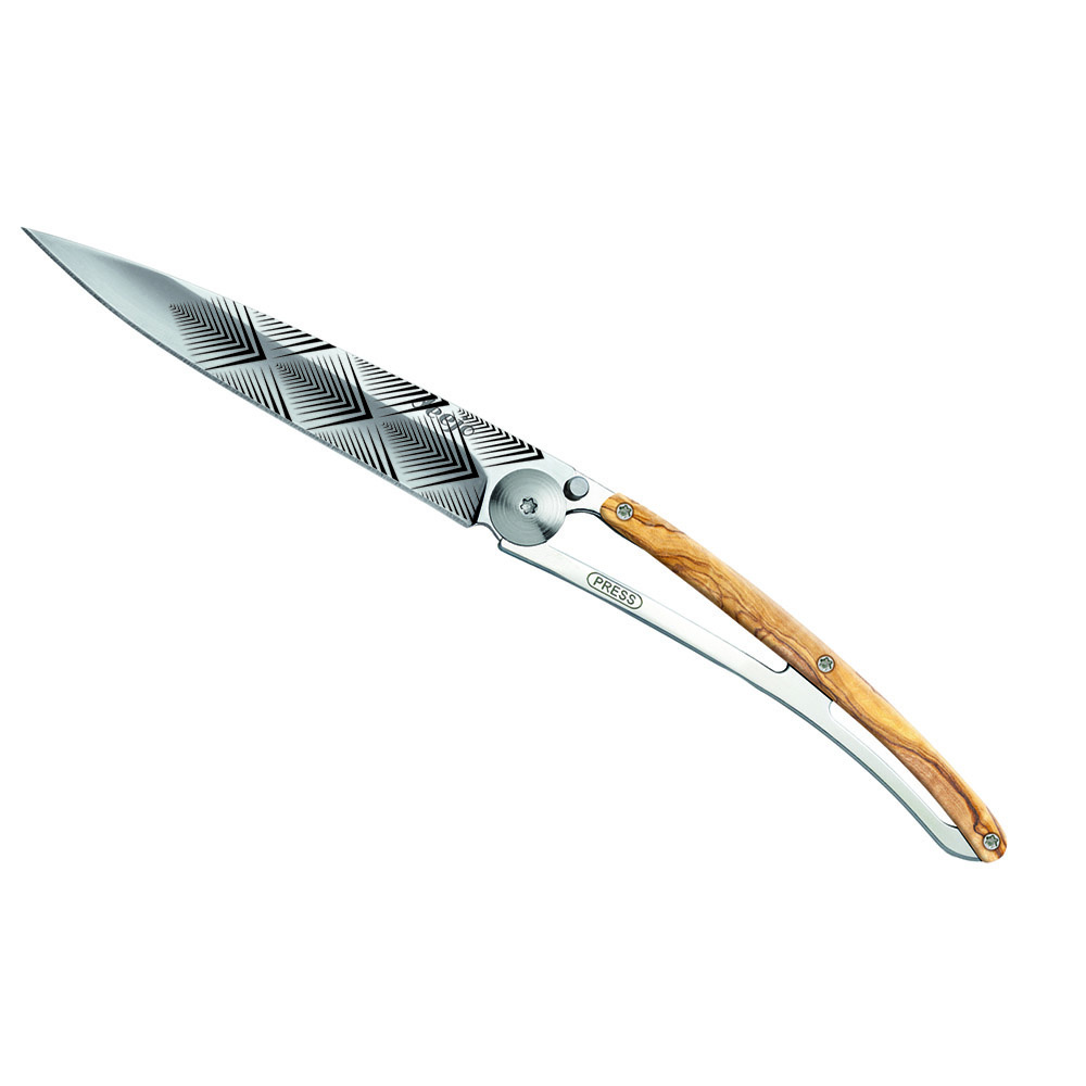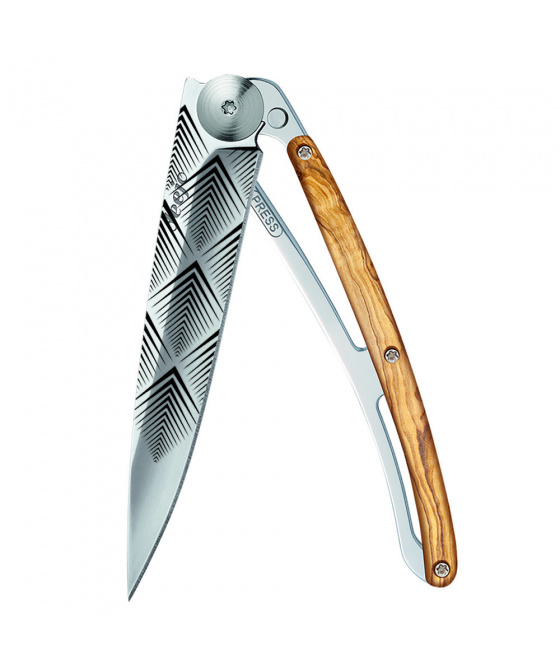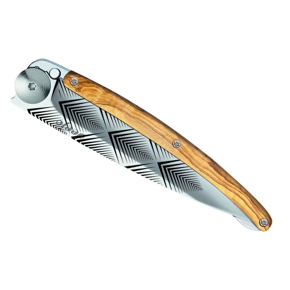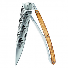 Stylový ultralehký nůž Deejo z kolekce Mirror se střenkou z olivového dřeva a čepelí s vysokým leskem a tetováním "Art déco".