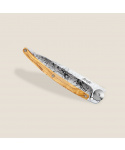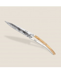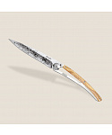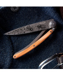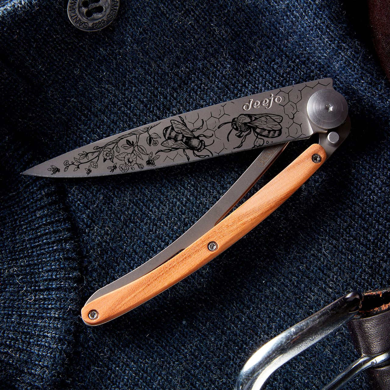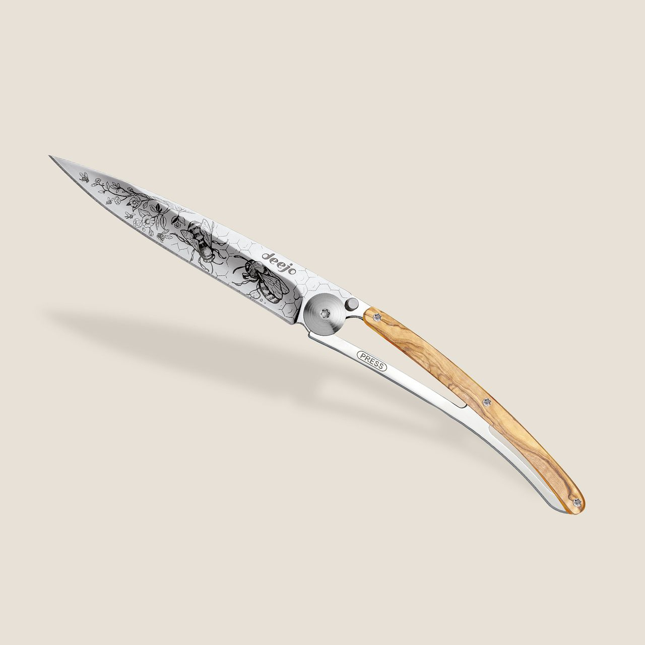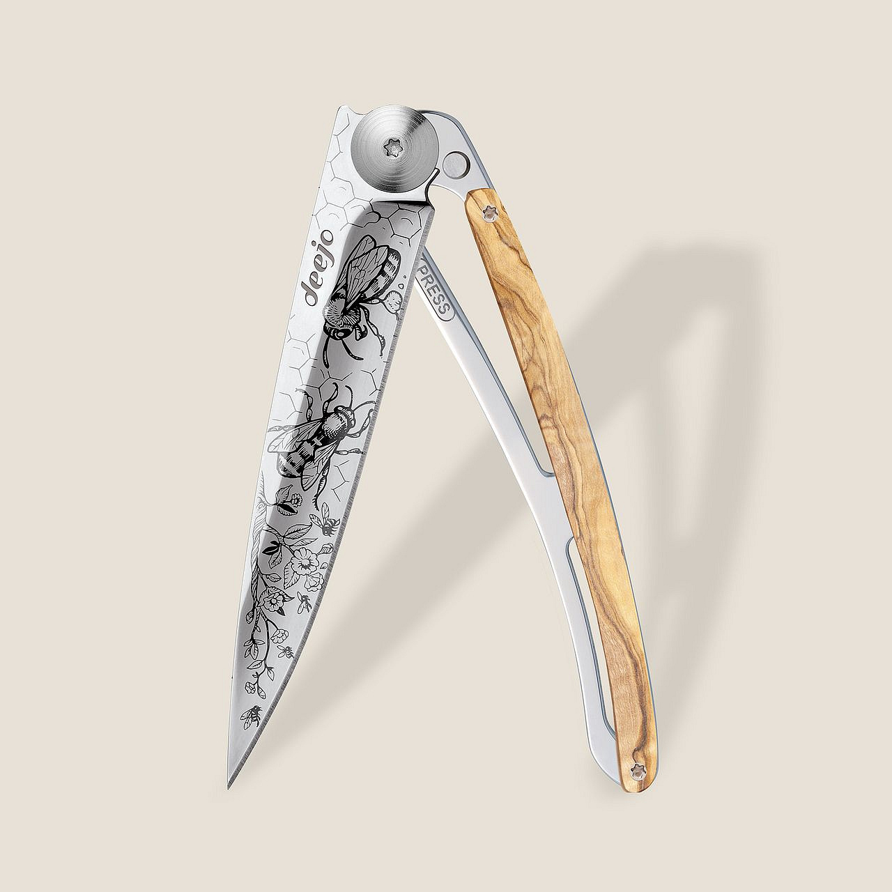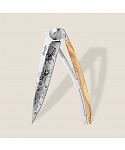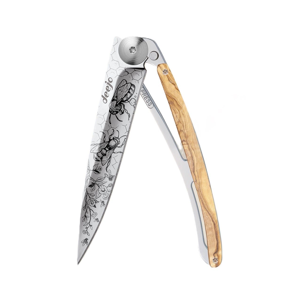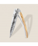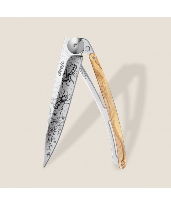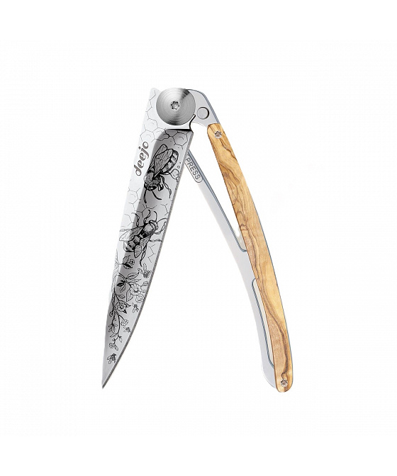 Stylový ultralehký nůž Deejo 37g z kolekce Mirror se střenkou z olivového dřeva a čepelí s vysokým leskem a tetováním Bees.