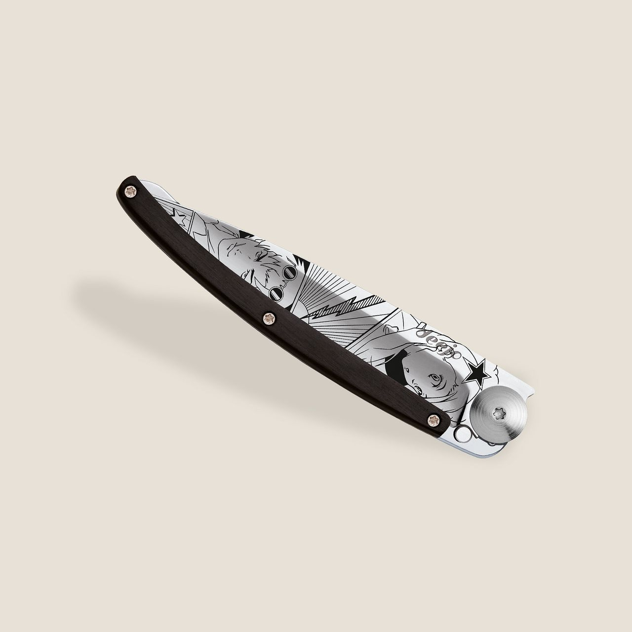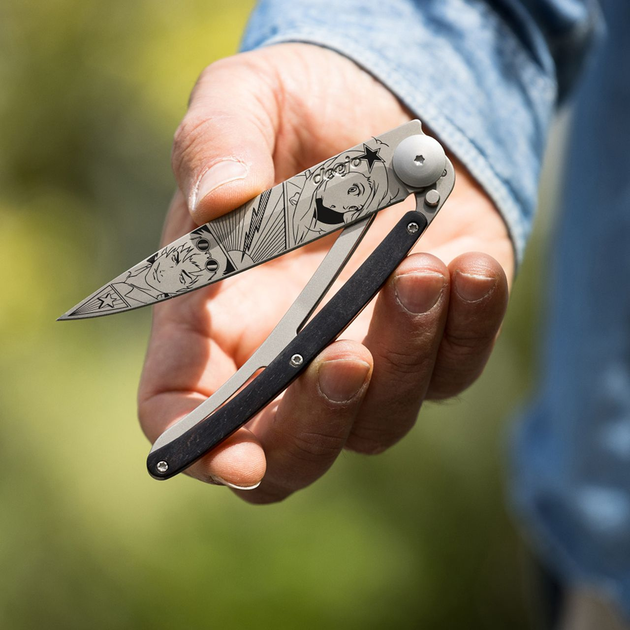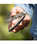 Stylový ultralehký nůž Deejo 37g z kolekce Mirror se střenkou z ebenového dřeva a čepelí s vysokým leskem a tetováním Manga Art.