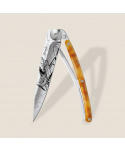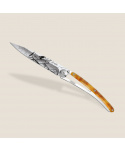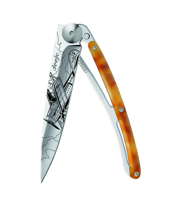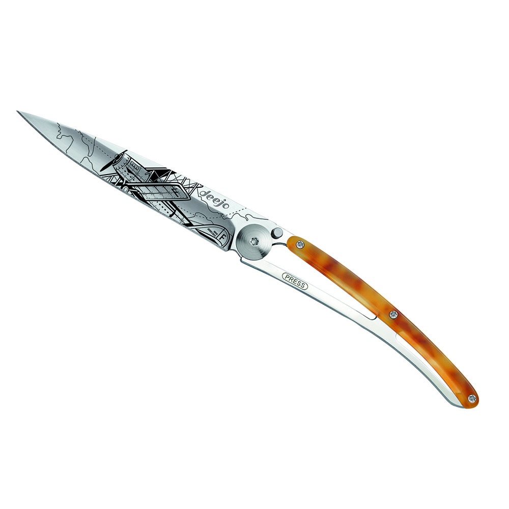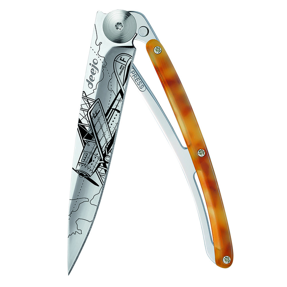 Stylový ultralehký nůž Deejo z kolekce Turtle se střenkou ze syntetické želvoviny a čepelí s vysokým leskem a tetovnáním "aviation".