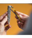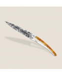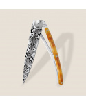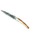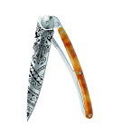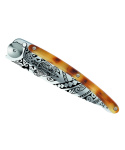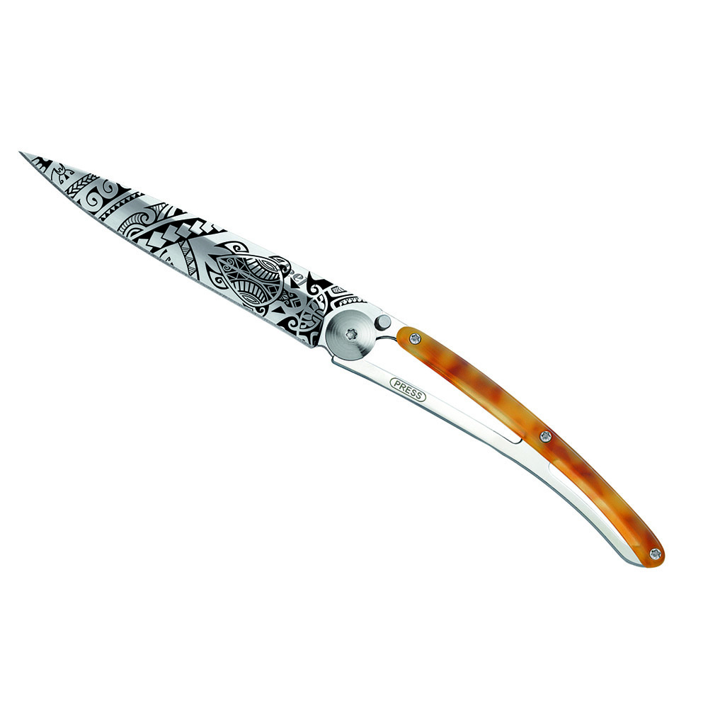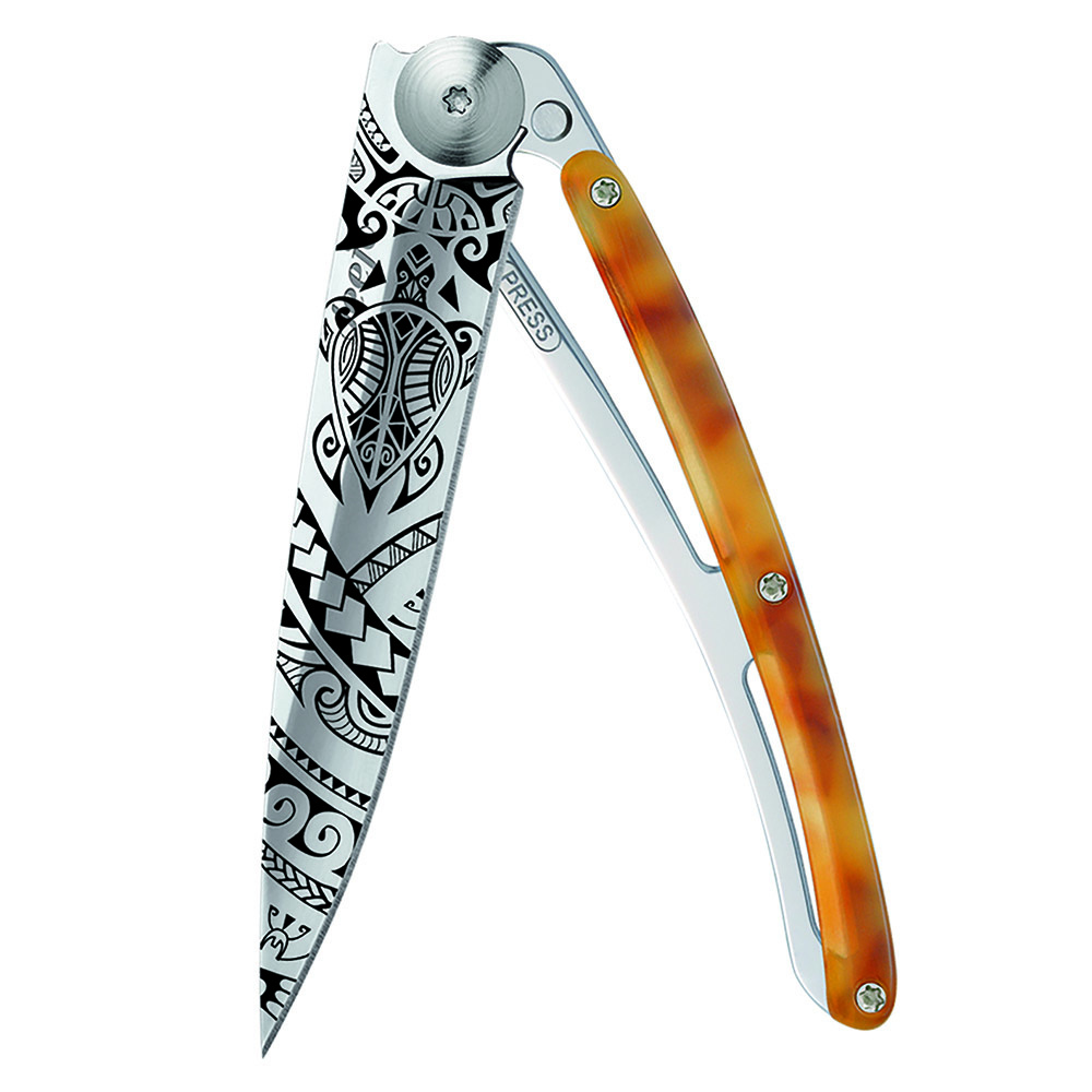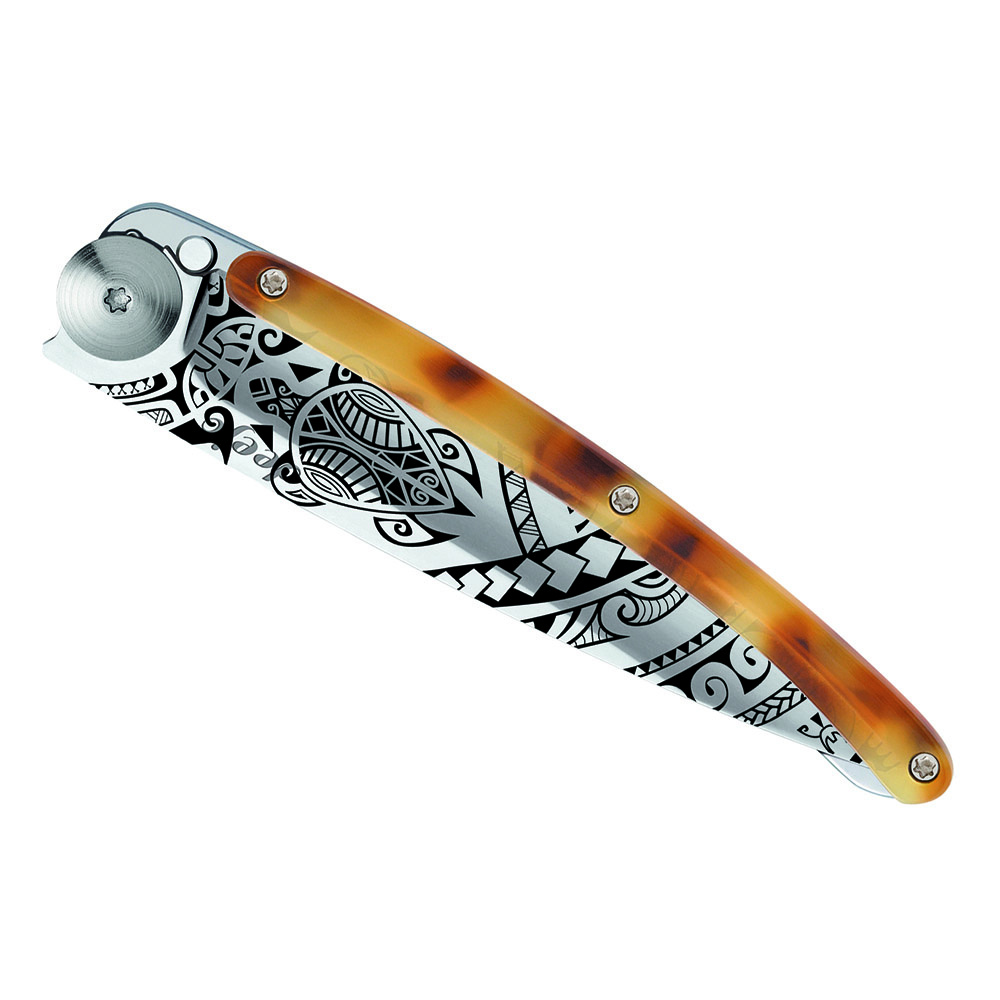 Stylový ultralehký nůž Deejo z kolekce Turtle se střenkou ze syntetické želvoviny a čepelí s vysokým leskem a tetovnáním "Polynesia".