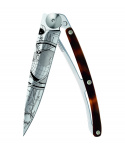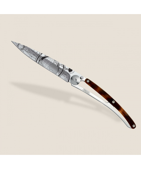 Stylový ultralehký nůž Deejo z kolekce Turtle se střenkou ze syntetické želvoviny a čepelí s vysokým leskem a tetovnáním "Globe trotter".