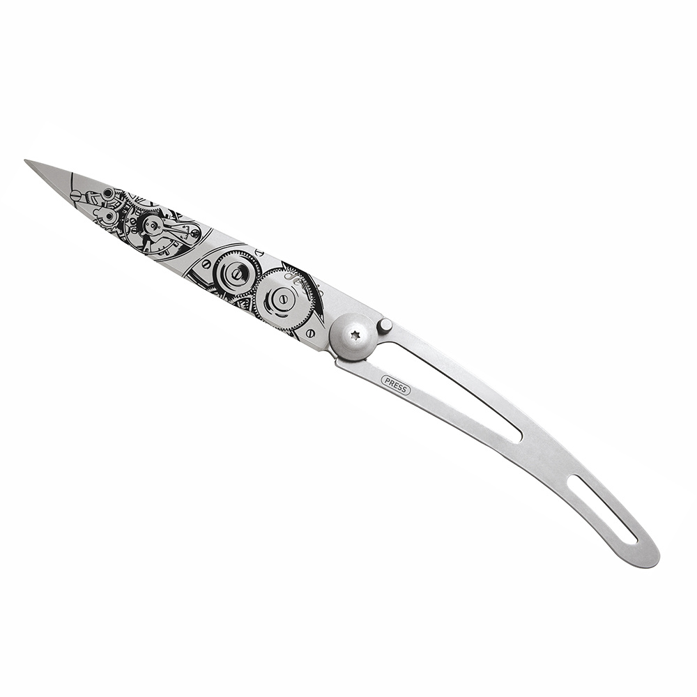 Stylový ultralehký nůž Deejo ze série Naháč, čepel s vysokým leskem, tetování "hodinář".