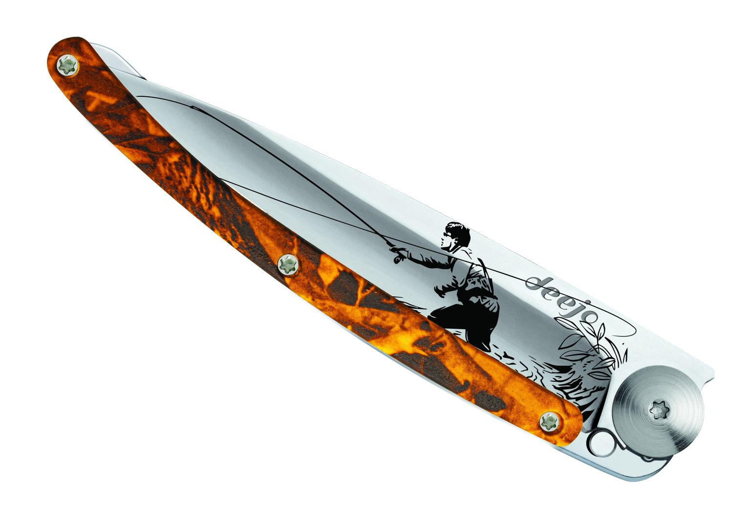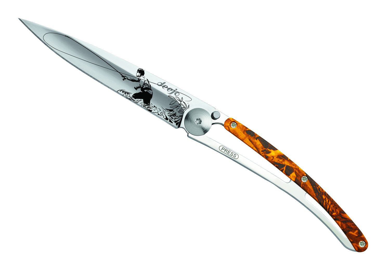 Stylový ultralehký nůž Deejo s hliníkovou střenkou s hydrografickým potiskem a čepelí s vysokým leskem a tetováním "fly fishing".