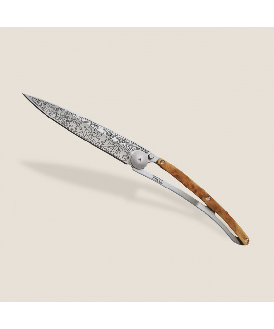 Stylový ultralehký nůž Deejo se střenkou z kořene exotického jalovce.