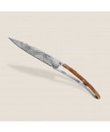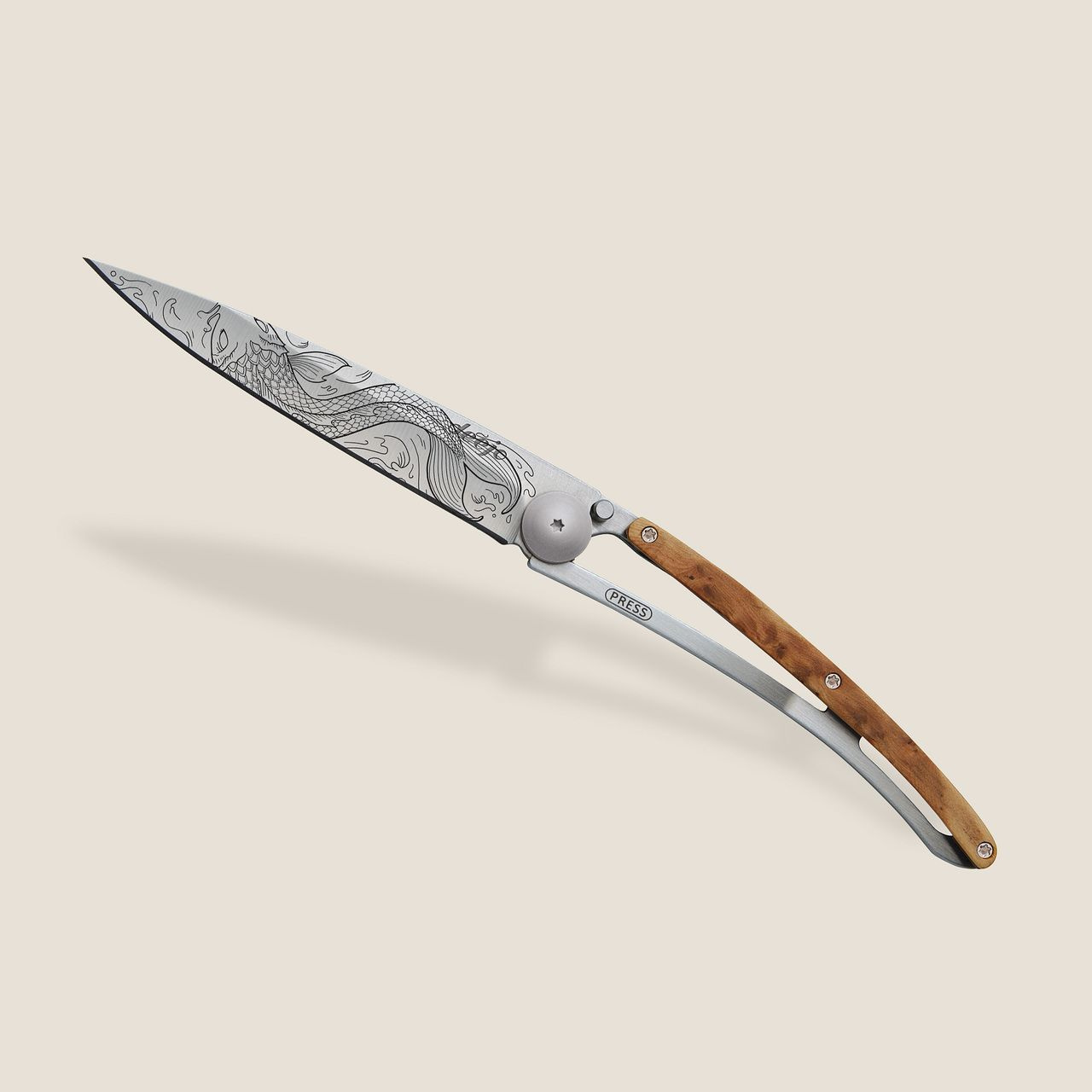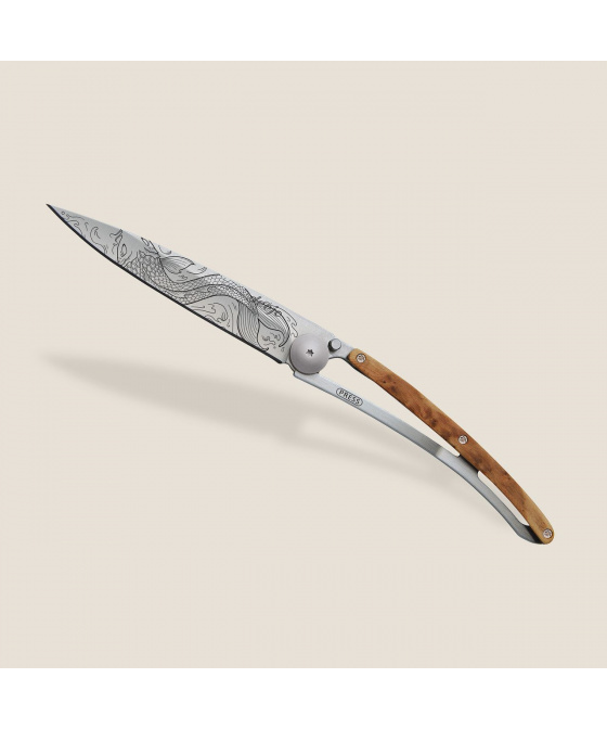 Stylový ultralehký nůž Deejo se střenkou z kořene exotického jalovce s tetováním ryby.