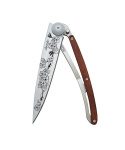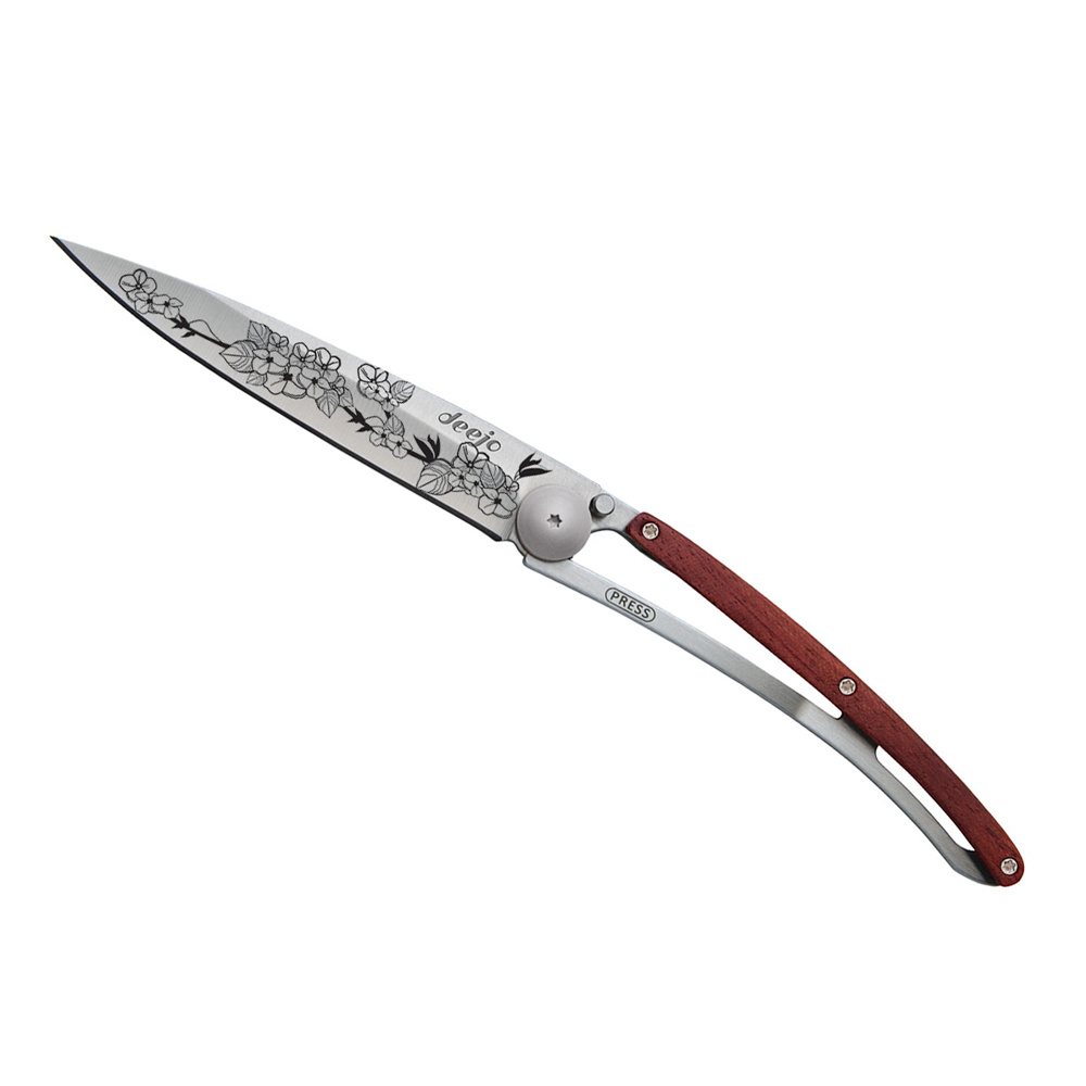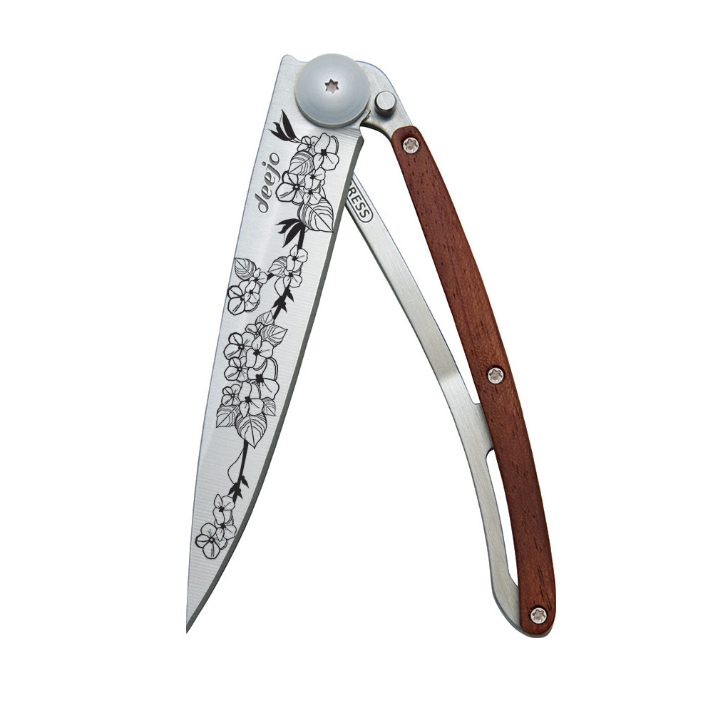 Stylový ultralehký nůž Deejo se střenkou z dřeviny coralwood a motivem "třešňový květ".