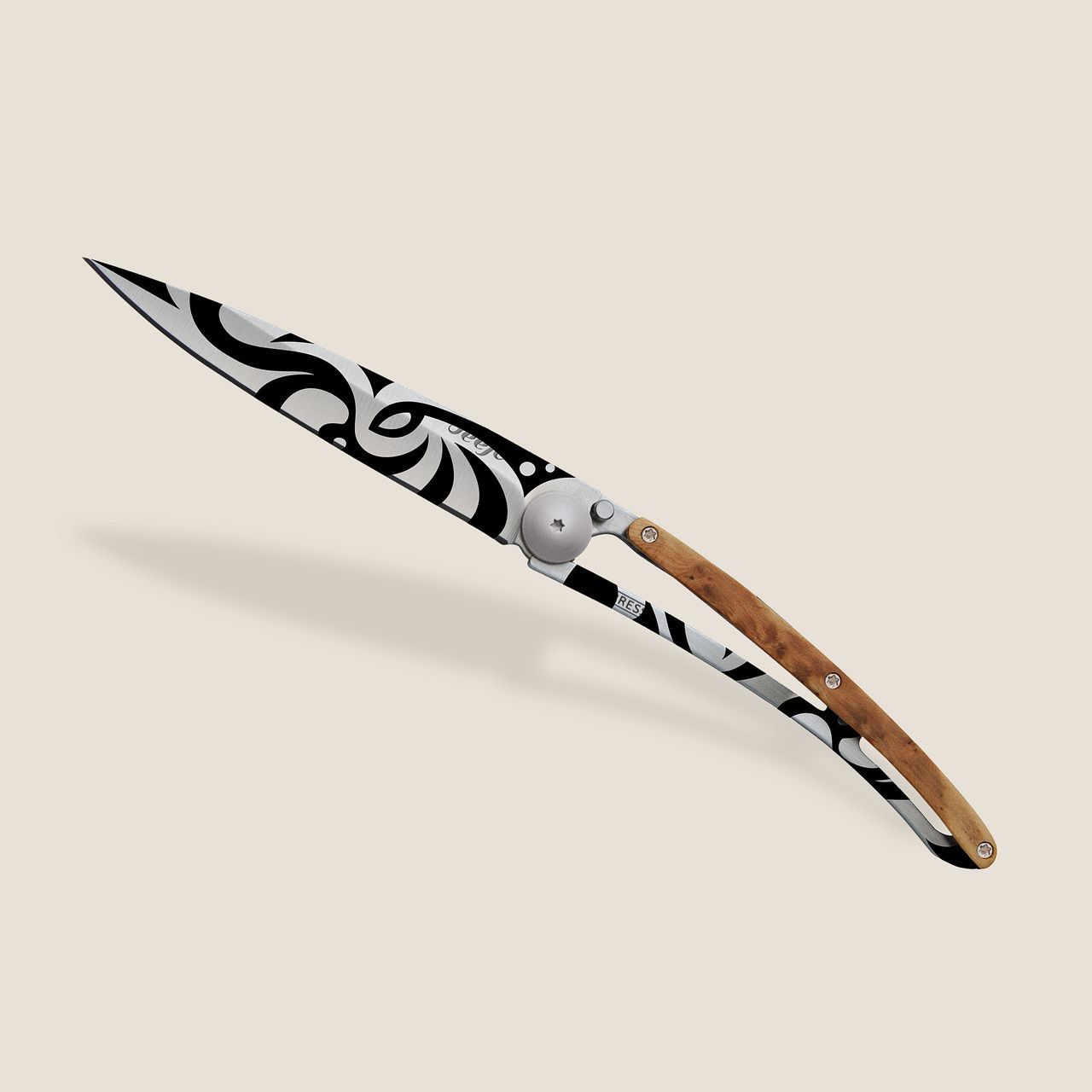Stylový ultralehký nůž Deejo se střenkou z kořene exotického jalovce.
