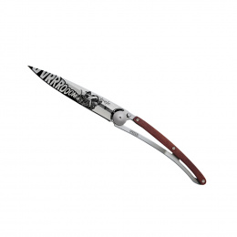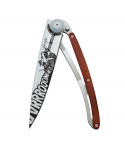 Stylový ultralehký nůž Deejo se střenkou z dřeviny coralwood s motivem "vroom".