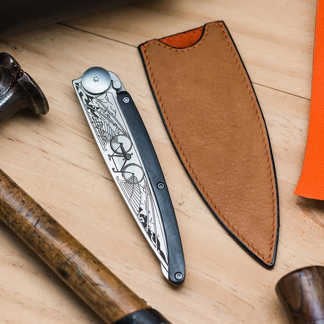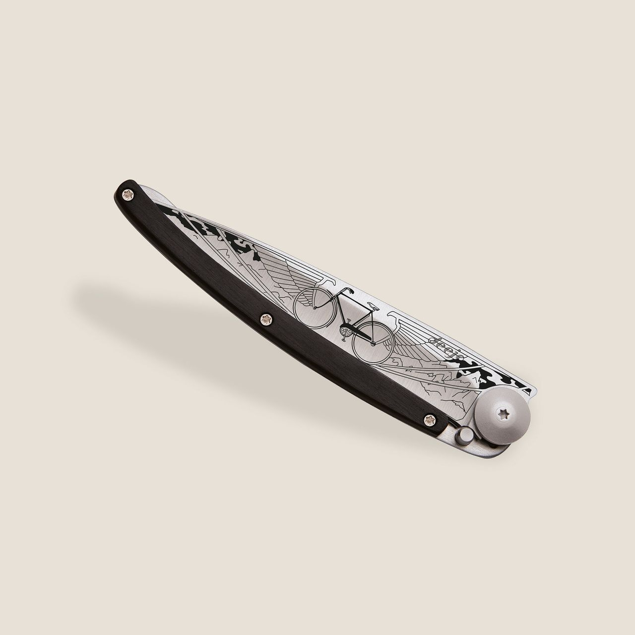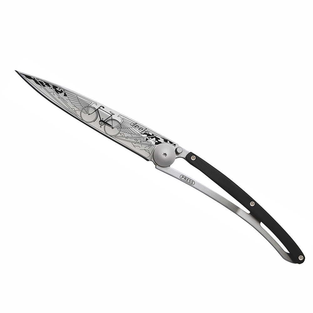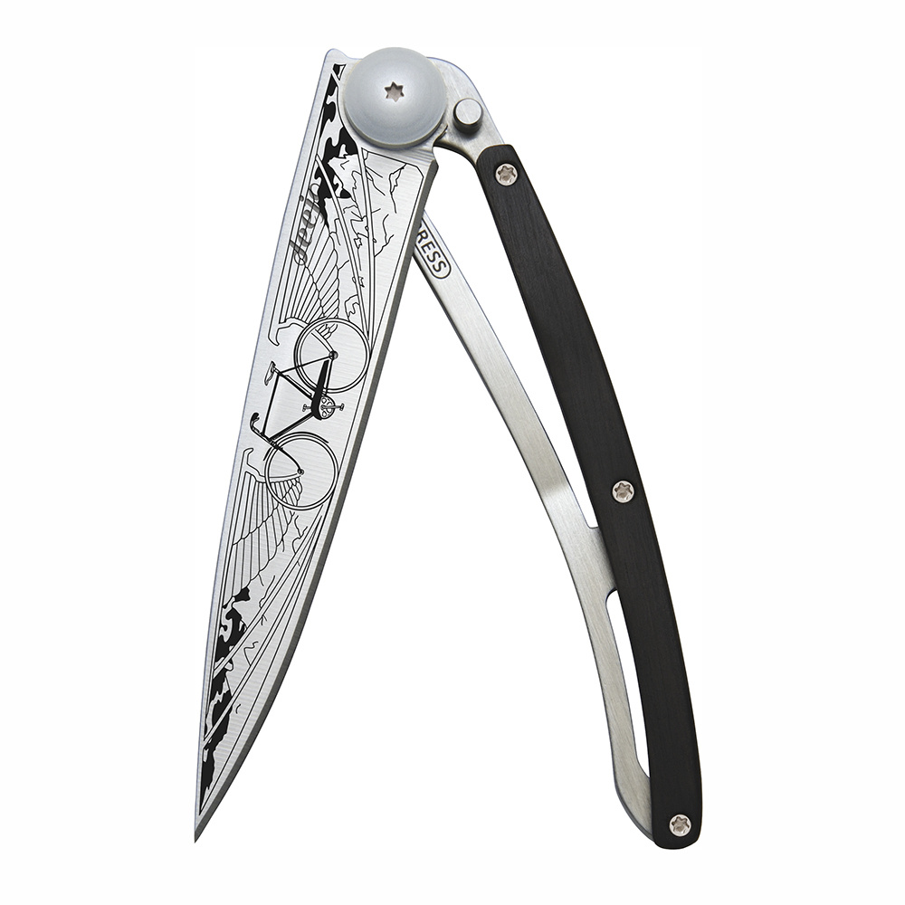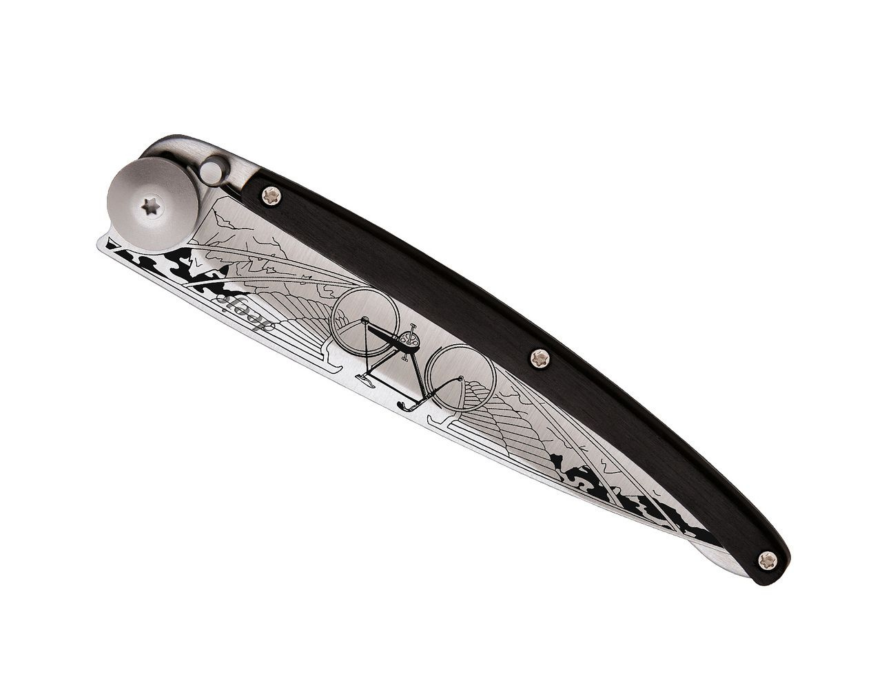 Stylový ultralehký nůž Deejo se střenkou z ebenového dřeva a tetováním "jízdní kolo"