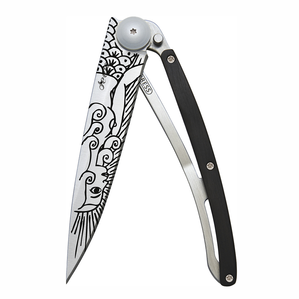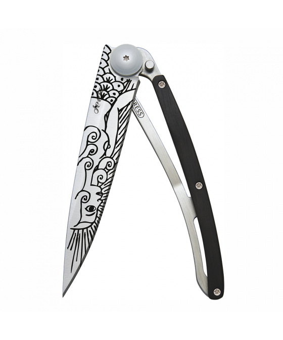 Stylový ultralehký nůž Deejo se střenkou z ebenového dřeva a tetováním "mořská panna"Více