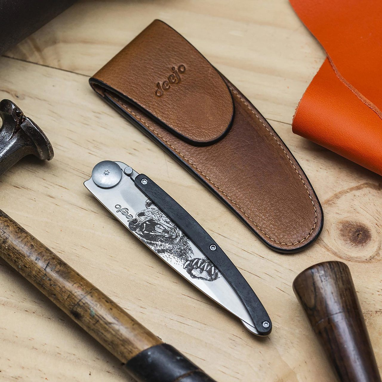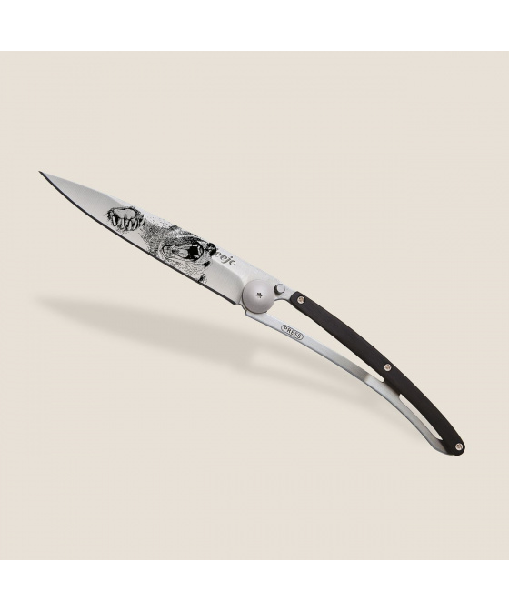 Stylový ultralehký nůž Deejo se střenkou z ebenového dřeva a tetováním "grizzly".