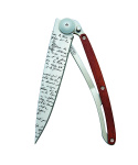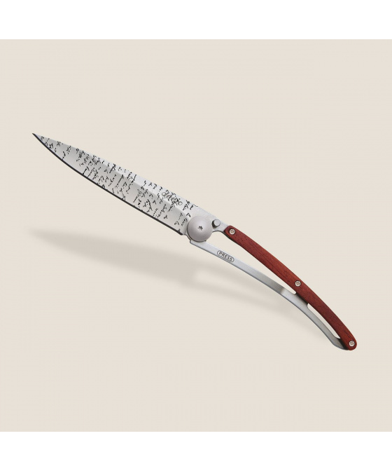 Stylový ultralehký nůž Deejo se střenkou z dřeva coralwood a motivem "manuscript".