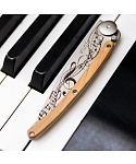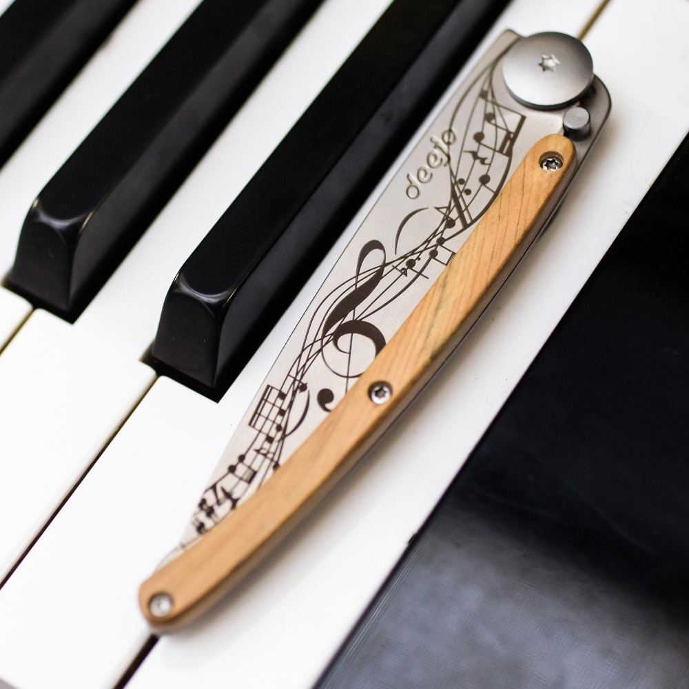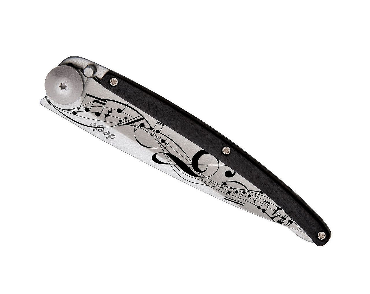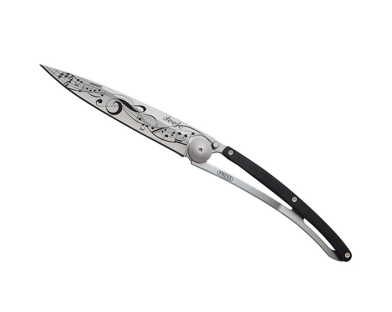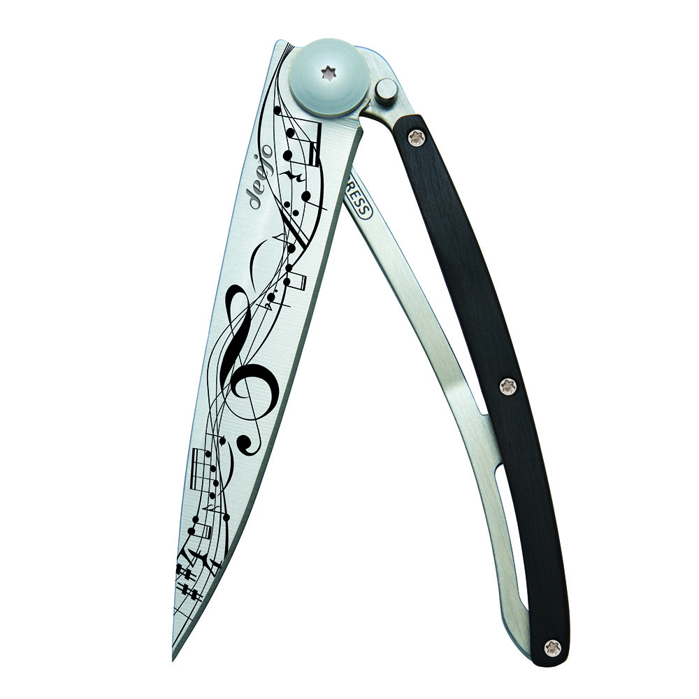 Stylový ultralehký nůž Deejo se střenkou z ebenového dřeva a motivem "hudební partitura".