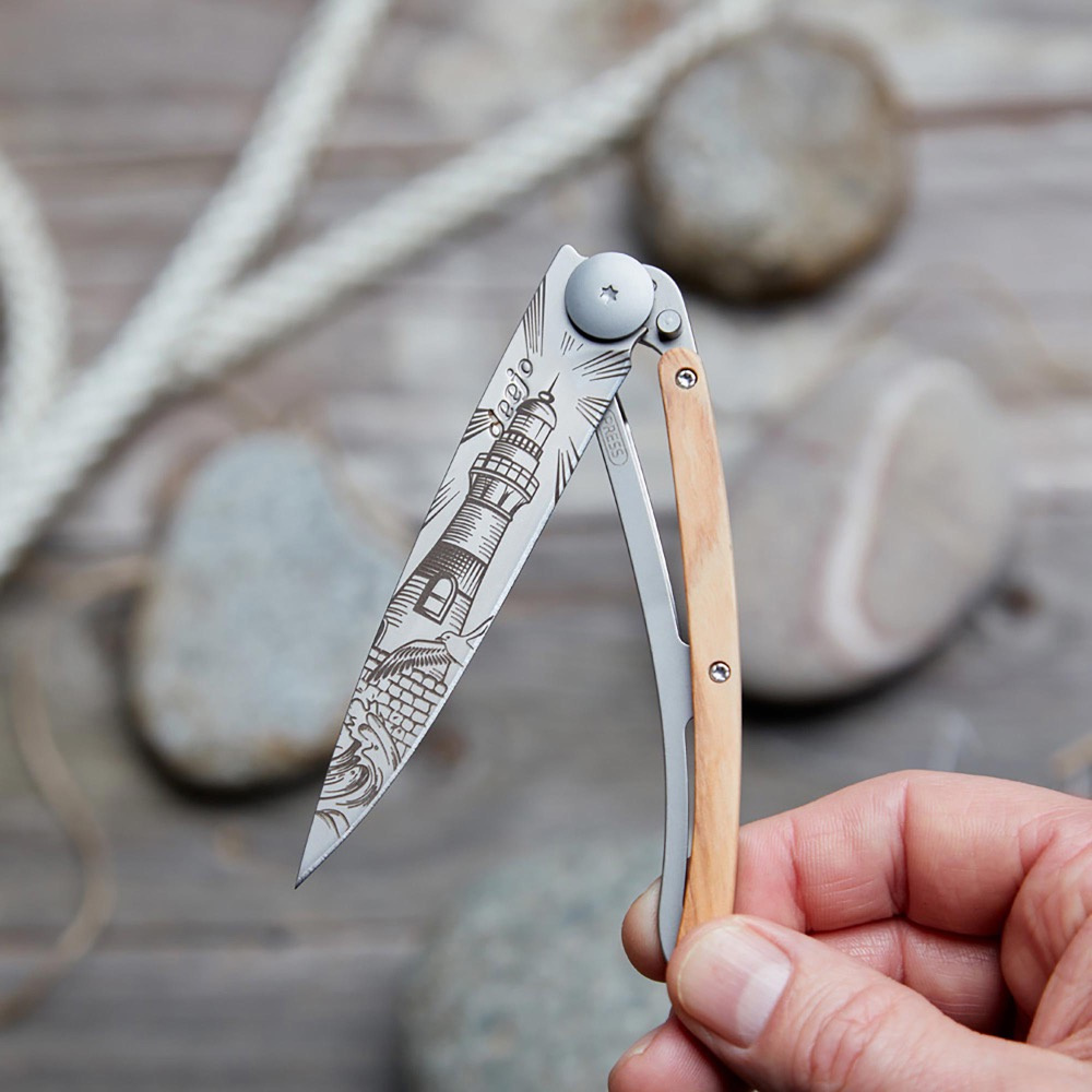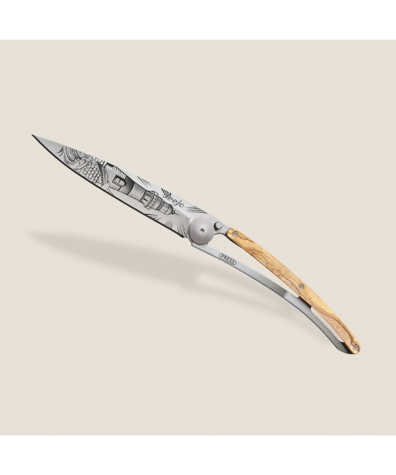 Stylový ultralehký nůž Deejo se střenkou z olivového dřeva a motivem "lighthouse".