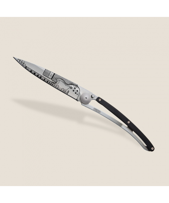 Stylový ultralehký nůž Deejo se střenkou z ebenového dřeva, čepel s tetováním Rock´n Roll.