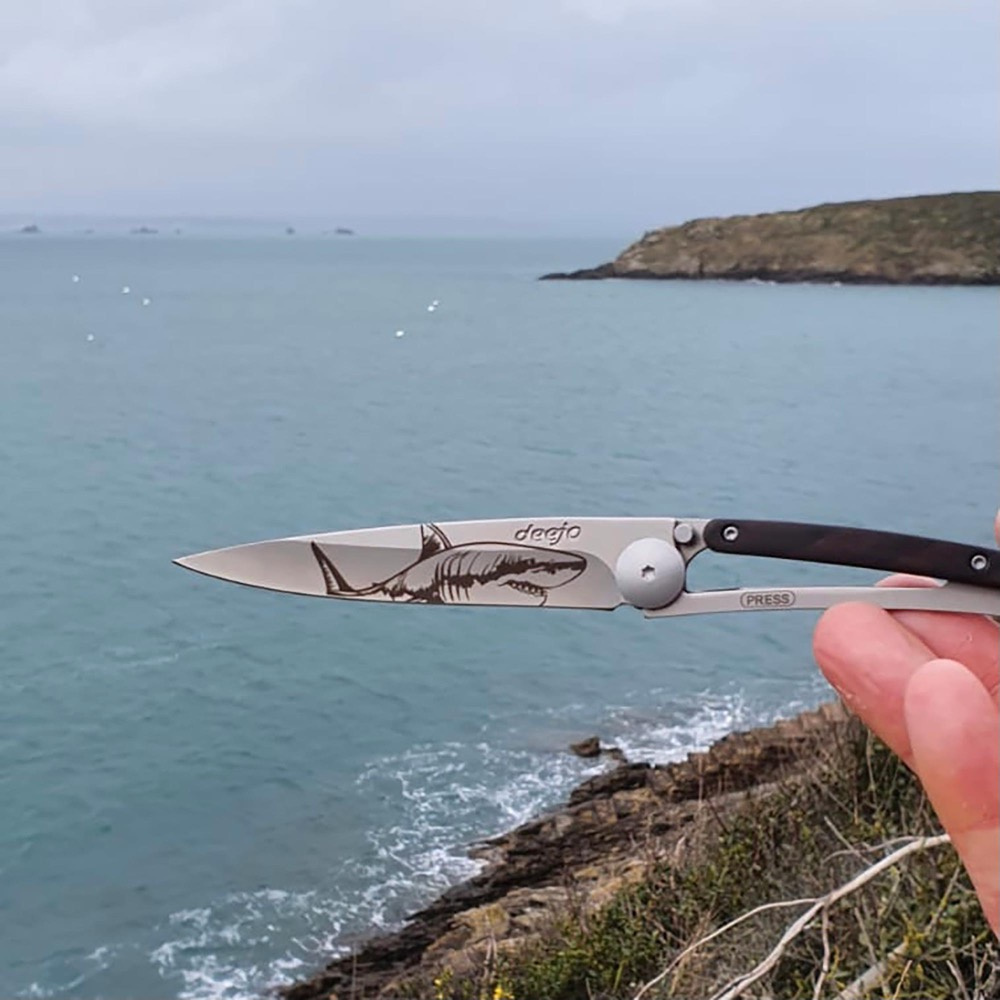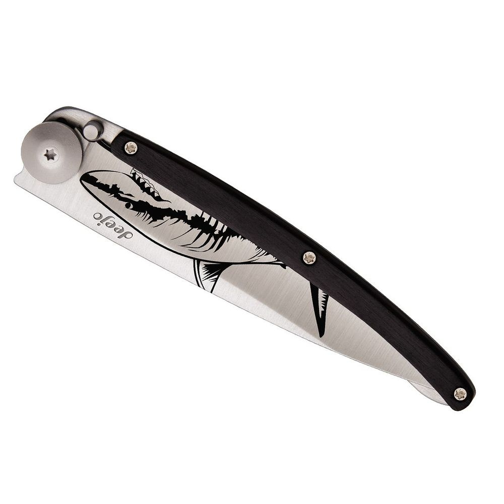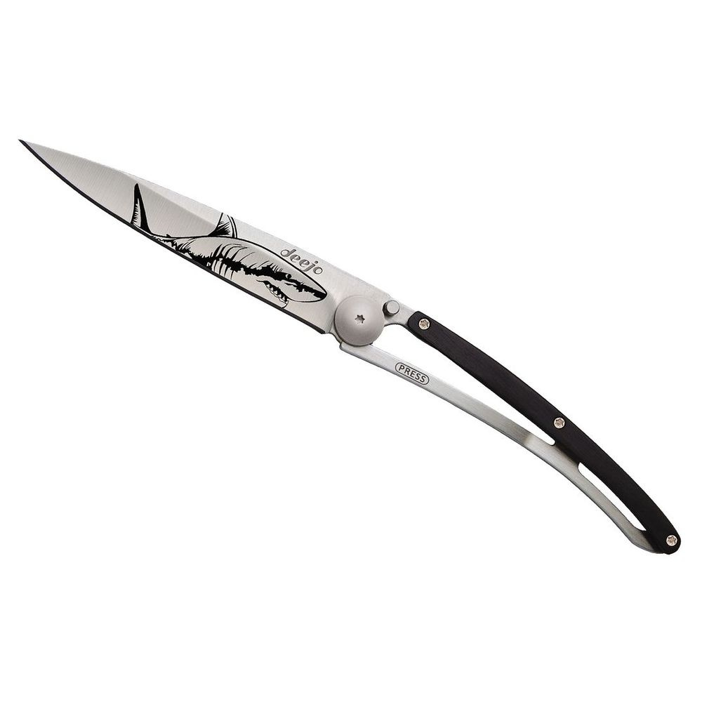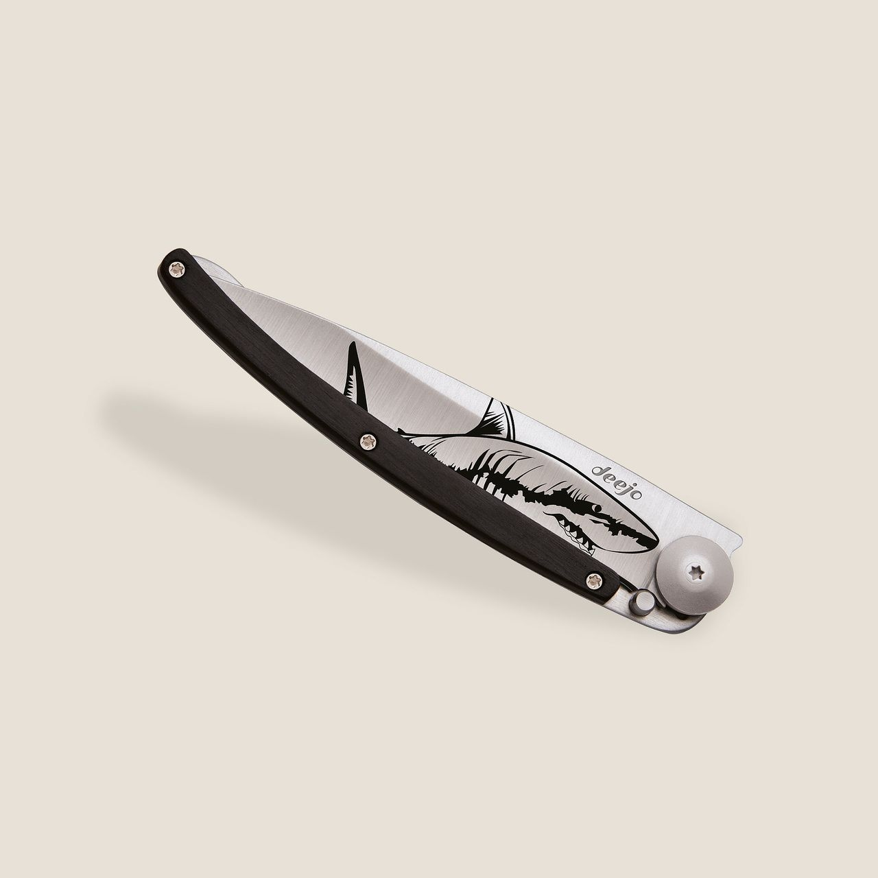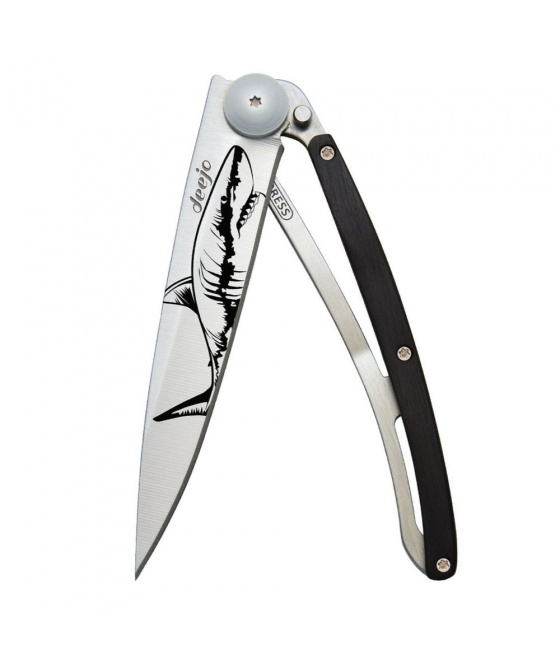 Stylový ultralehký nůž Deejo se střenkou z ebenového dřeva, čepel s tetováním žraloka.