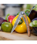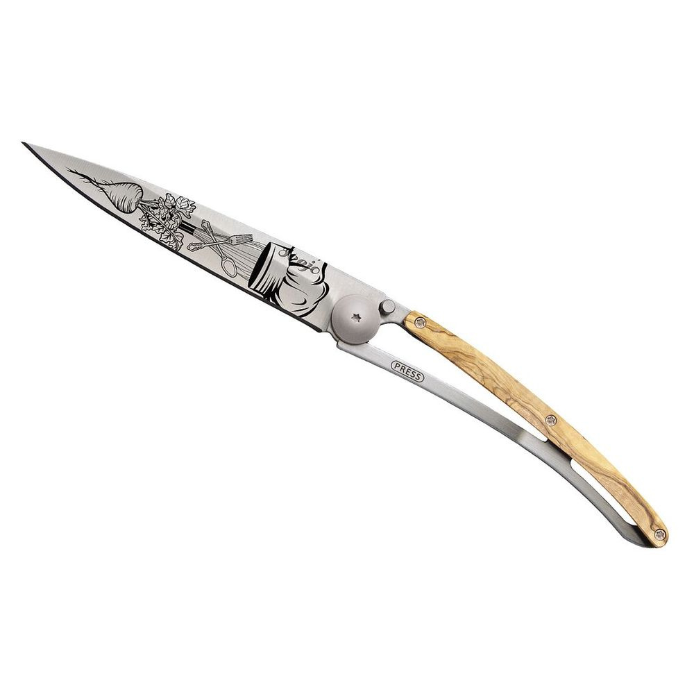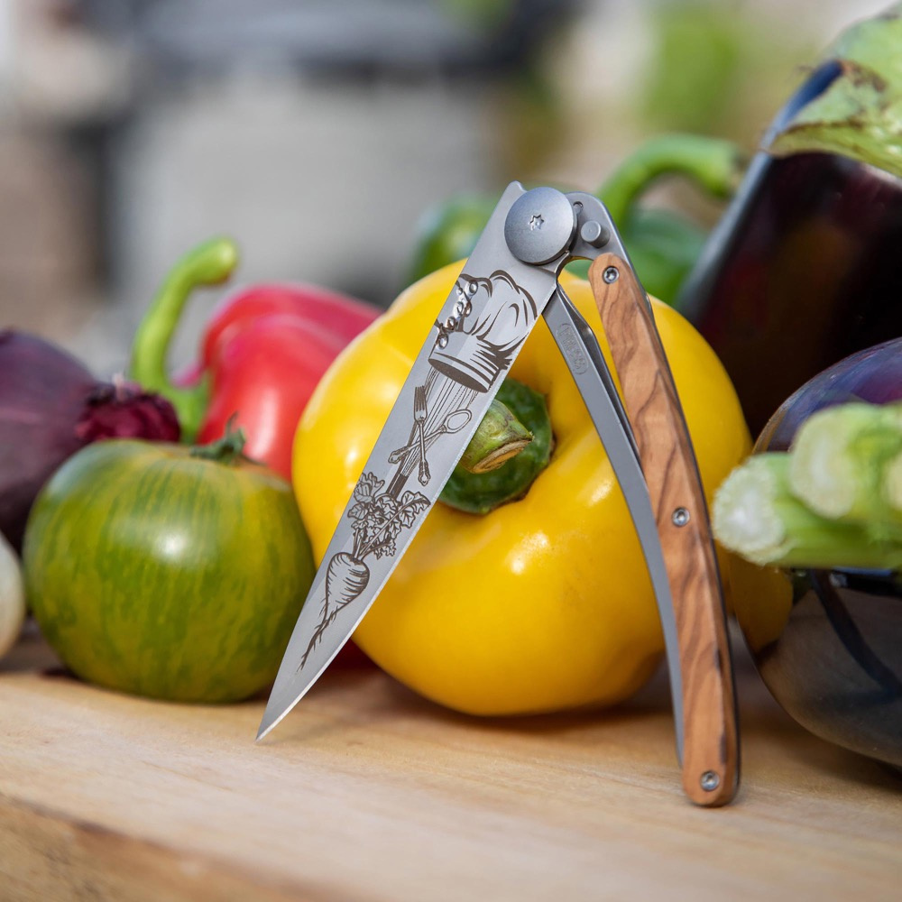 Stylový ultralehký nůž Deejo se střenkou z olivového dřeva a motivem kuchařské čepice.Více
