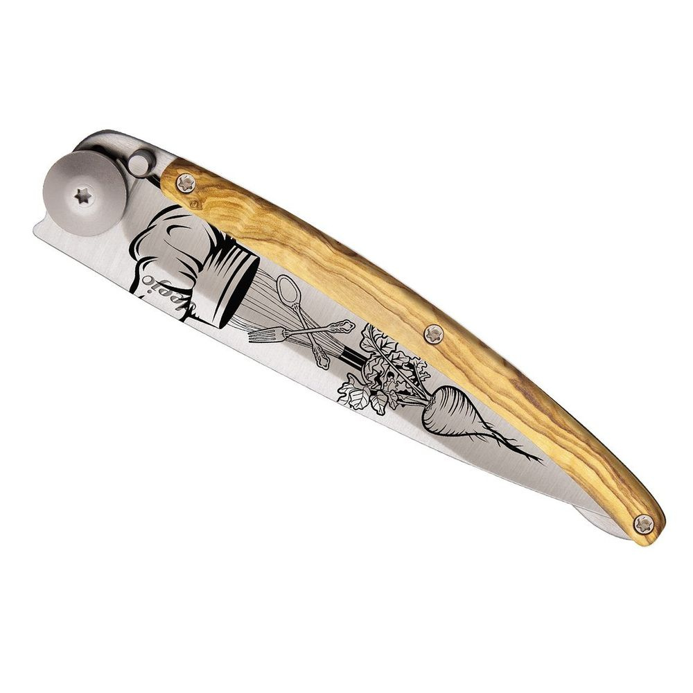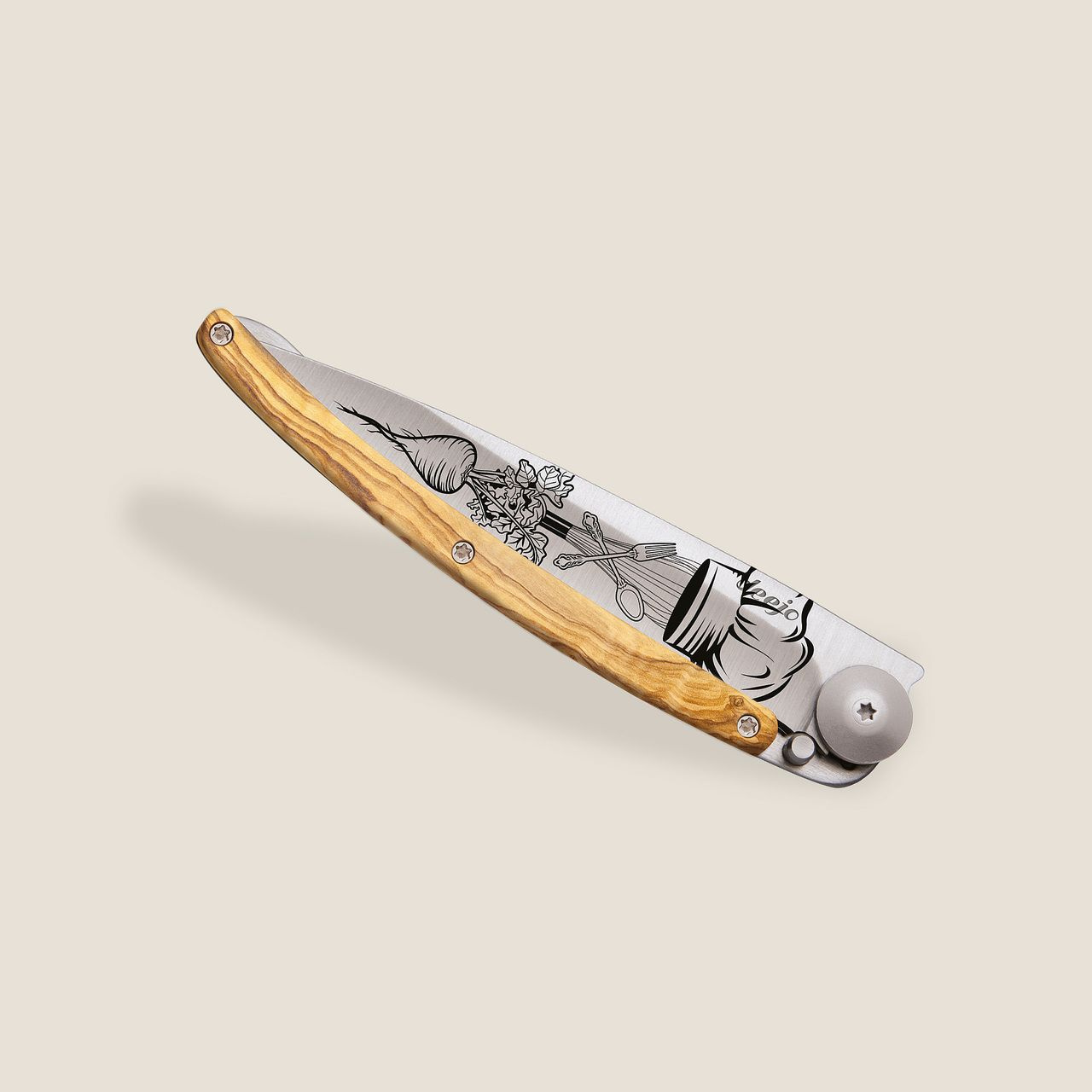 Stylový ultralehký nůž Deejo se střenkou z olivového dřeva a motivem kuchařské čepice.