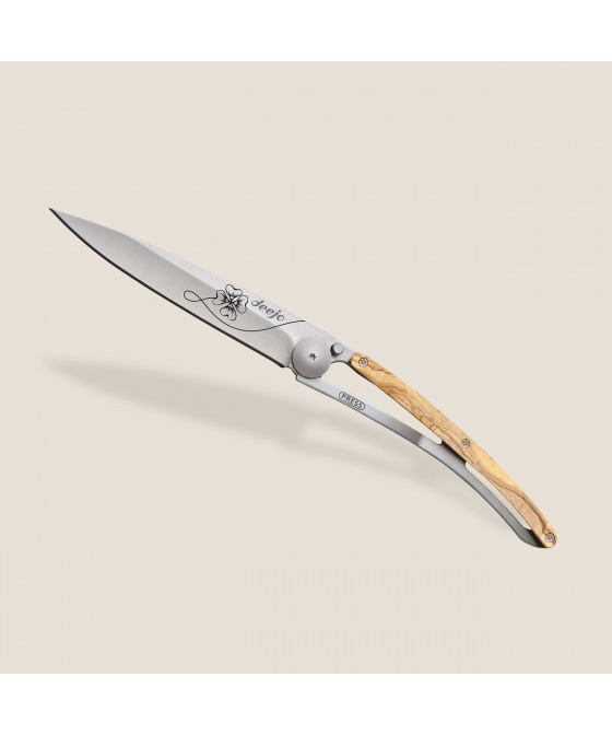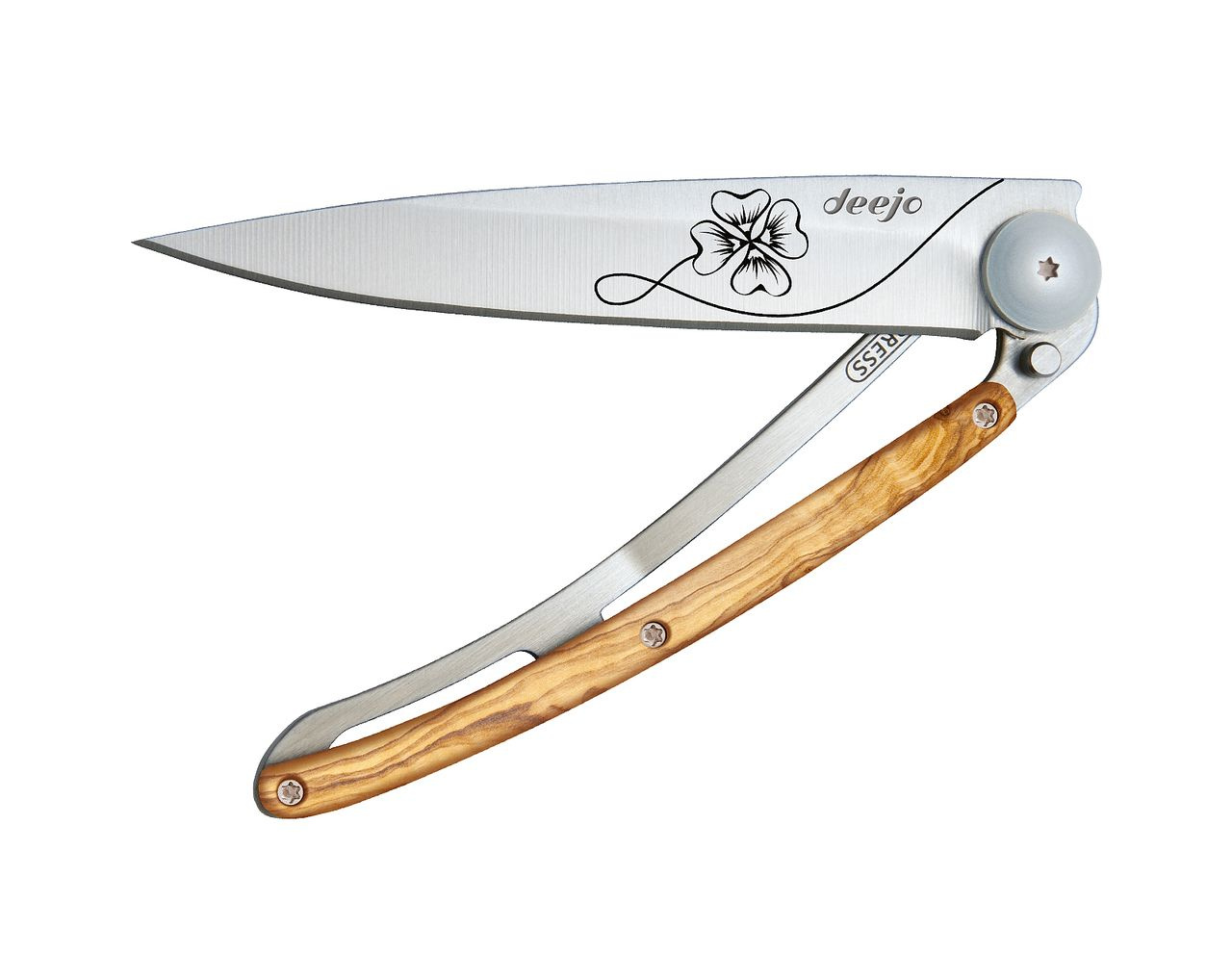 Stylový ultralehký nůž Deejo se střenkou z olivového dřeva a motivem čtyřlístku - znamení štěstí.