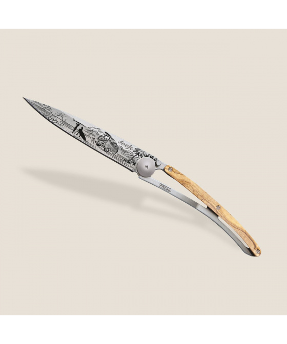 Stylový ultralehký nůž Deejo se střenkou z olivového dřeva a motivem života v obytce na pláži.
