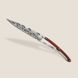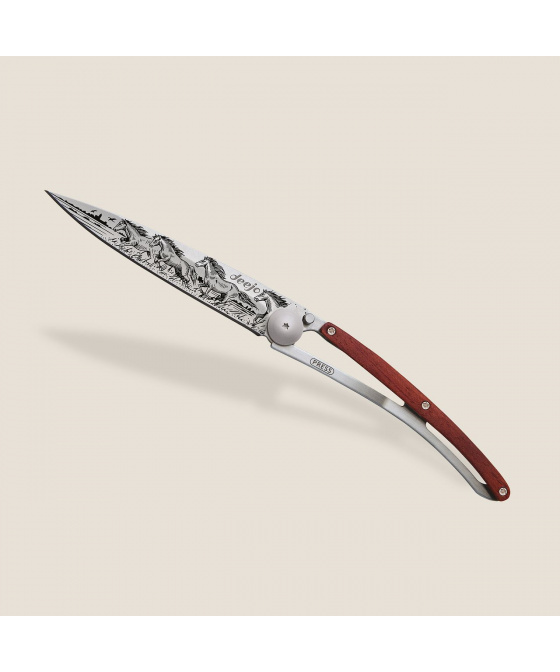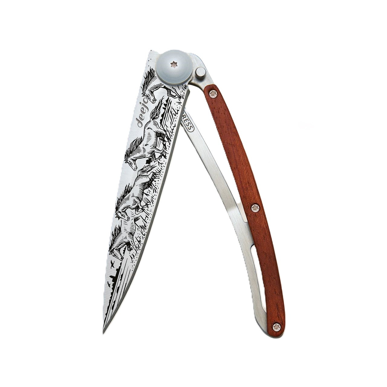 Stylový ultralehký nůž Deejo se střenkou z dřeviny coralwood s motivem koní pádících přírodou.