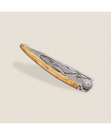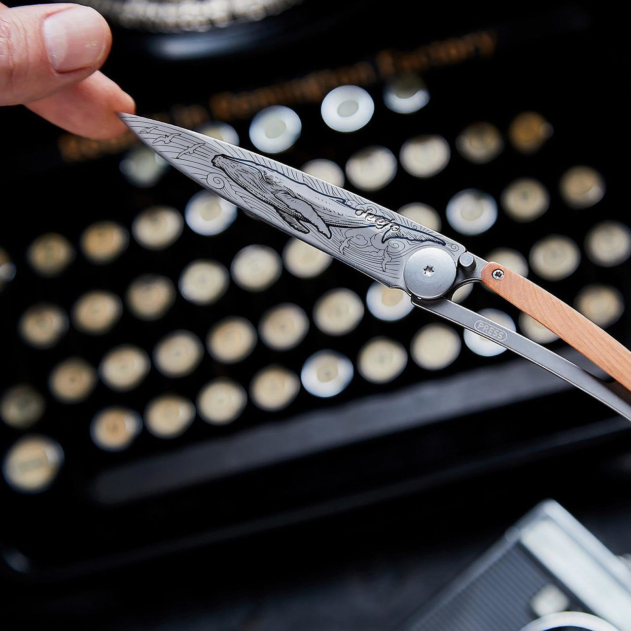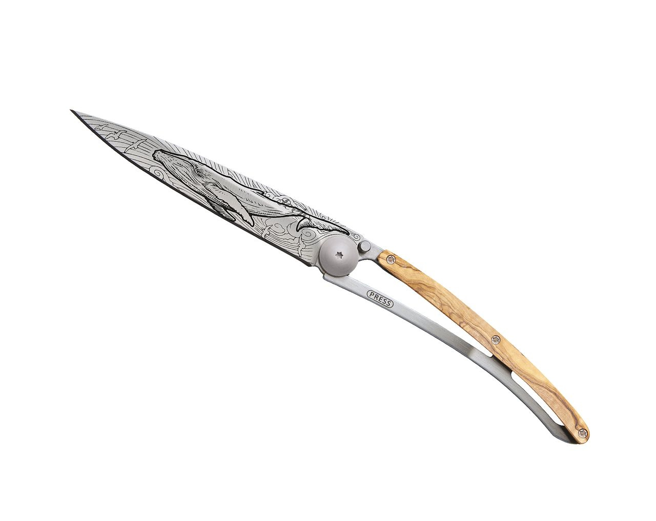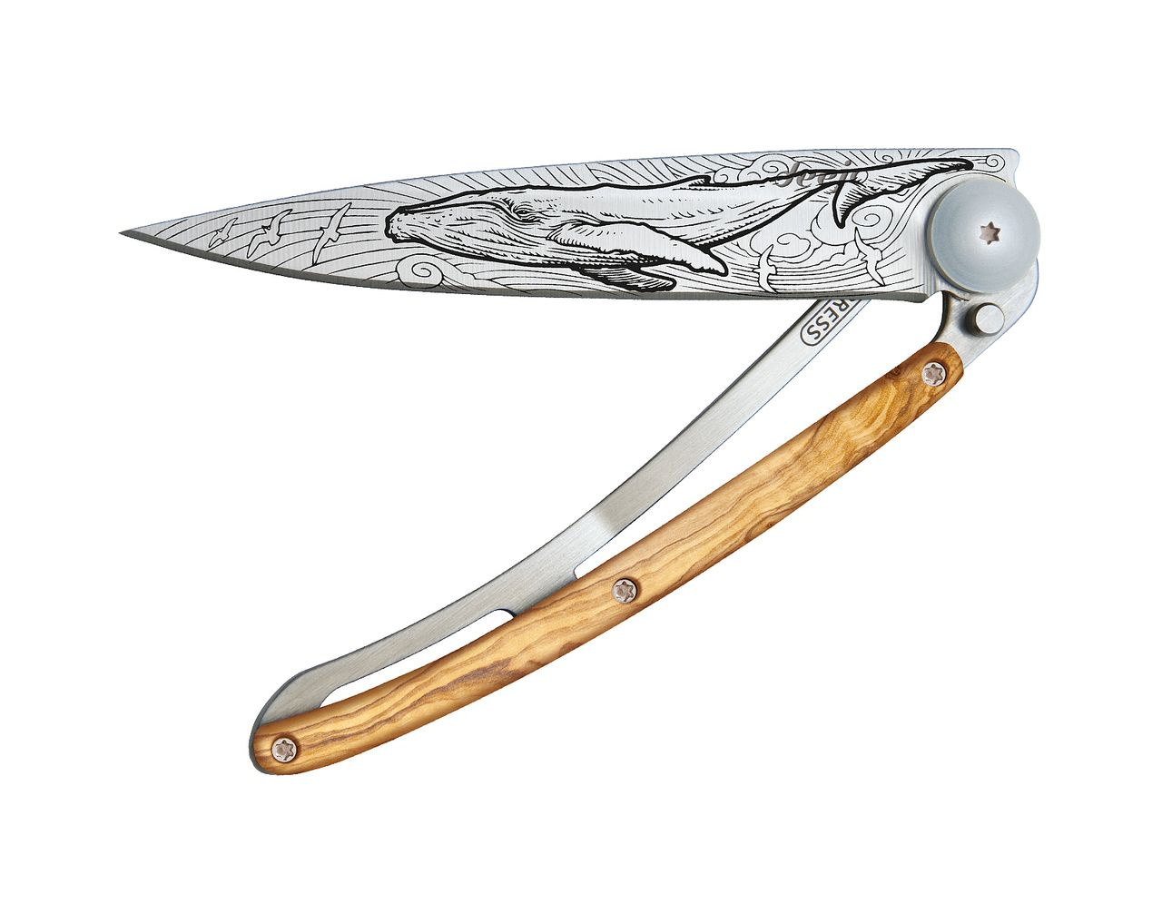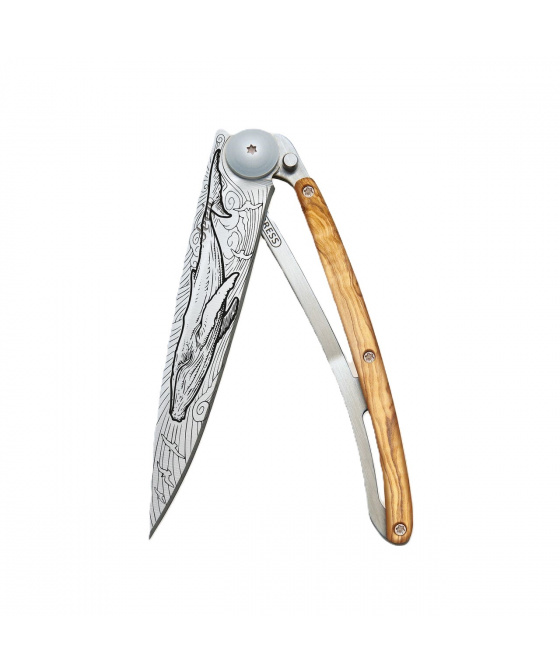 Stylový ultralehký nůž Deejo se střenkou z olivového dřeva a motivem velryby.