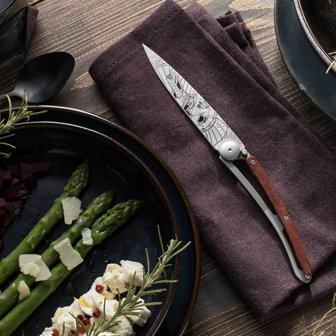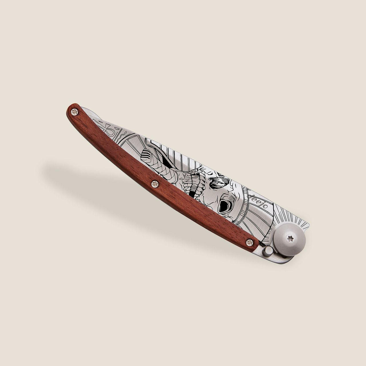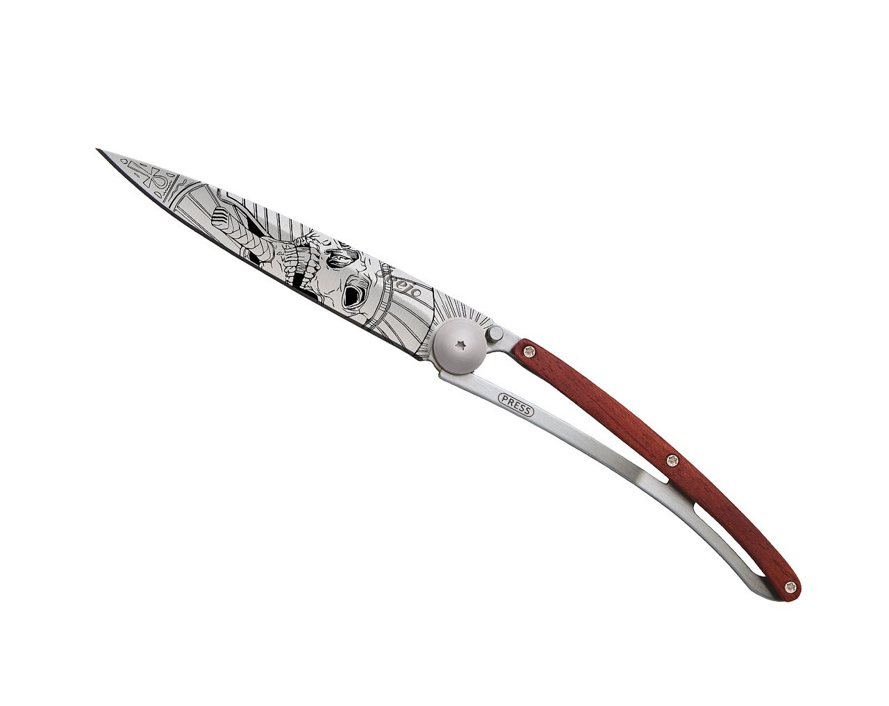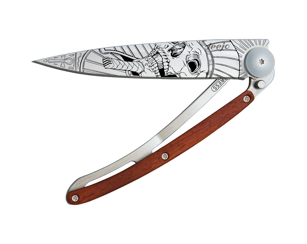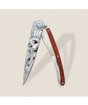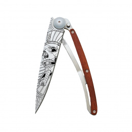Stylový ultralehký nůž Deejo se střenkou z dřeviny coralwood a tetováním "faraonova lebka".