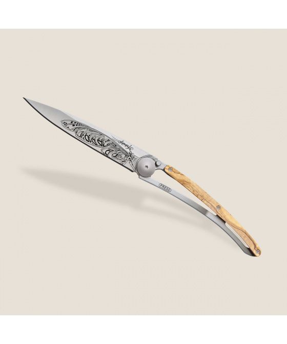 Stylový ultralehký nůž Deejo se střenkou z olivového dřeva a motivem motýla.