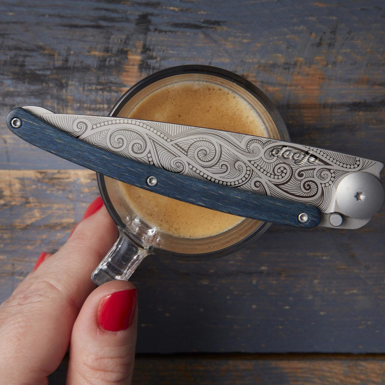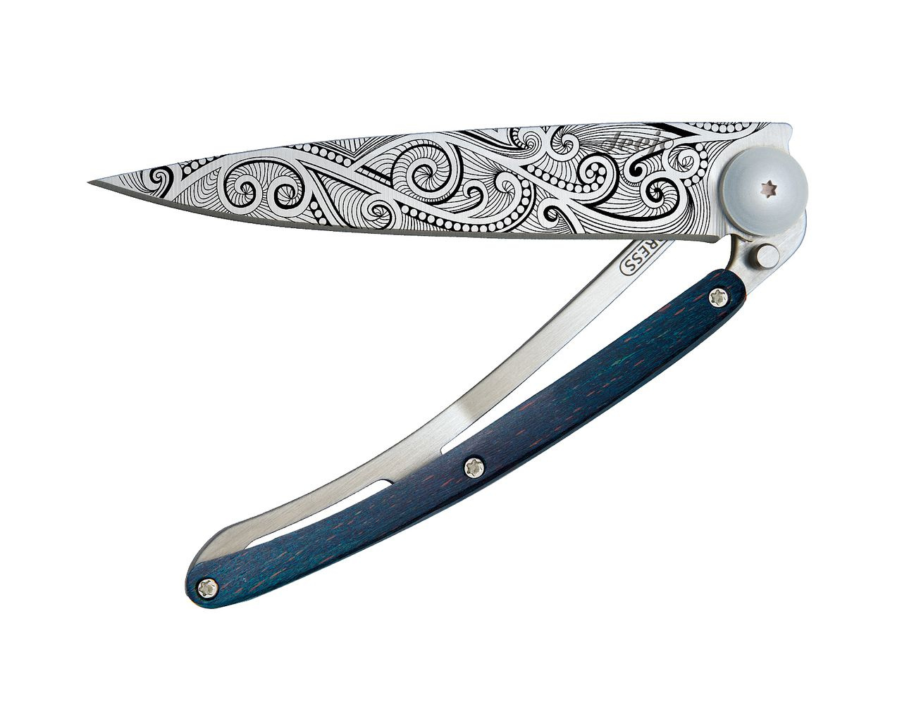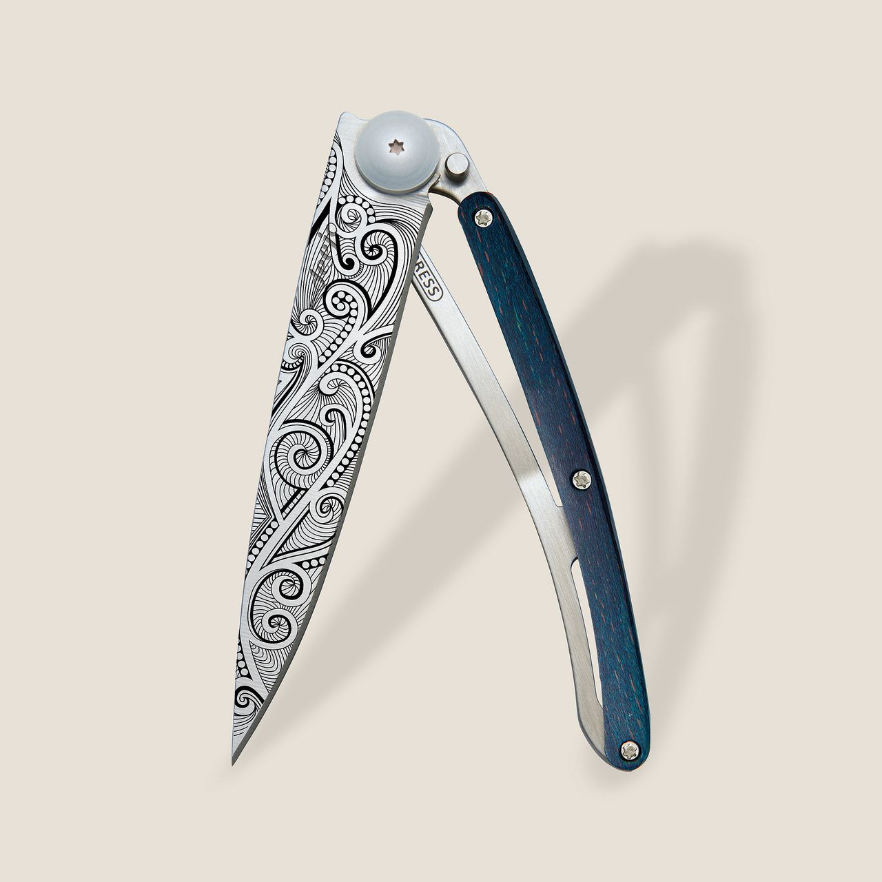 Stylový ultralehký nůž Deejo se střenkou z olivového dřeva a motivem mořských vln.Více
