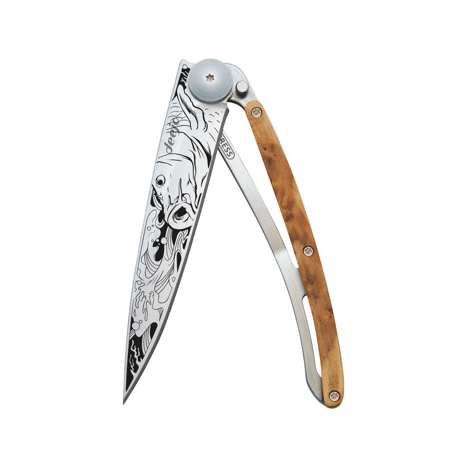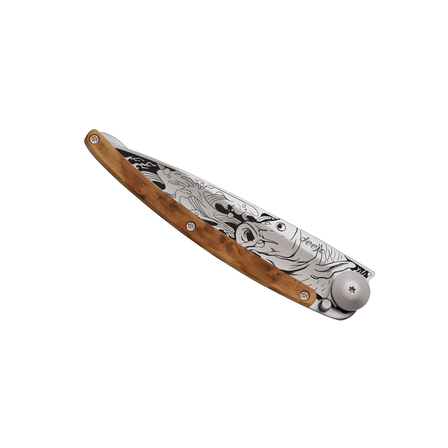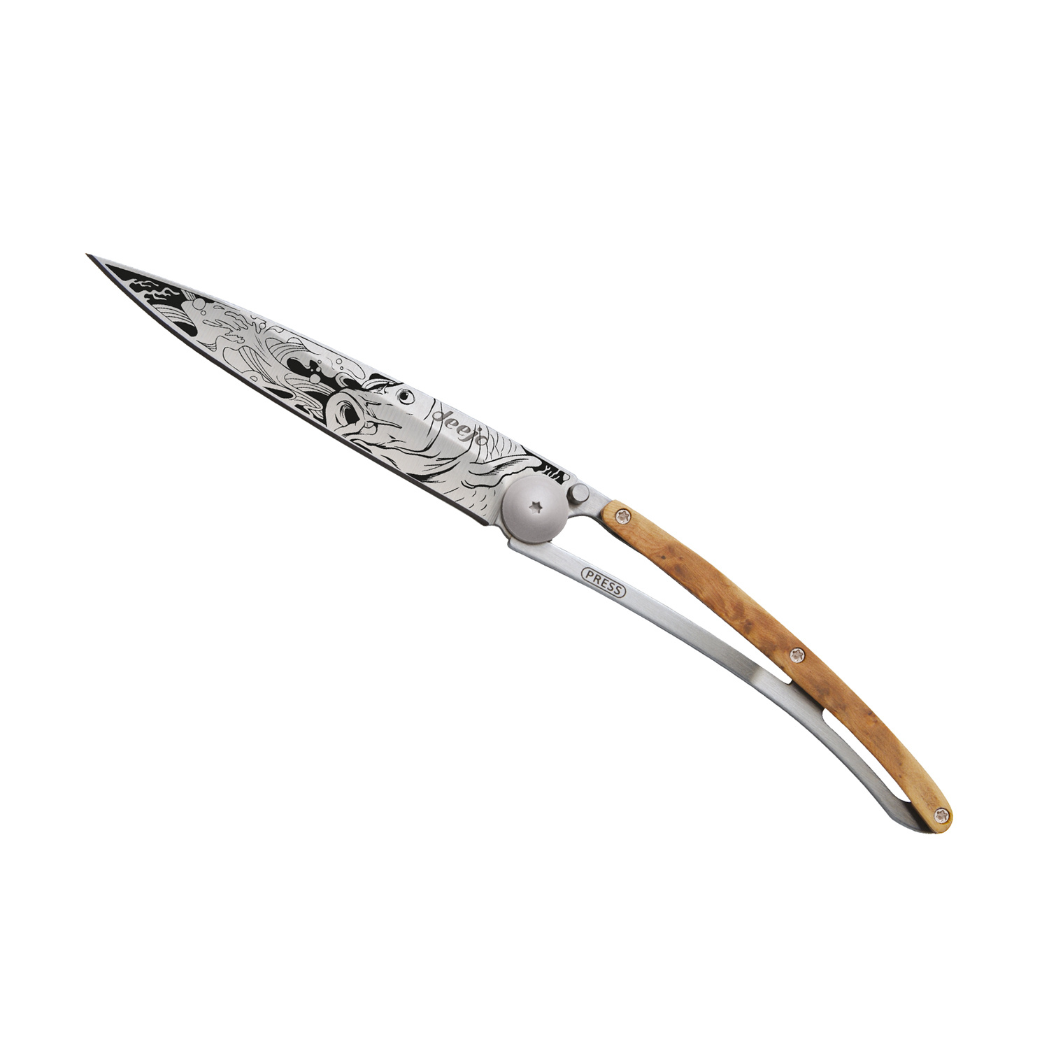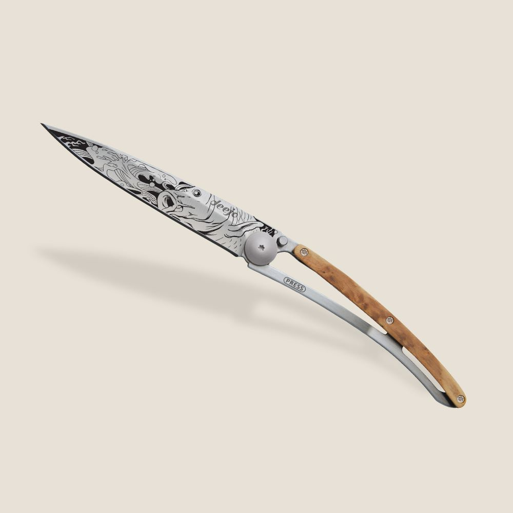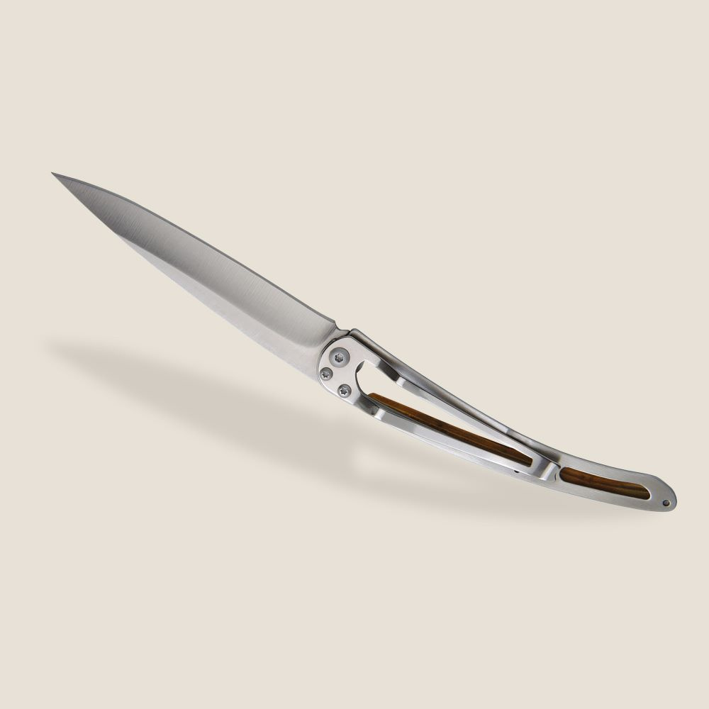 Stylový ultralehký nůž Deejo se střenkou z kořene exotického jalovce.