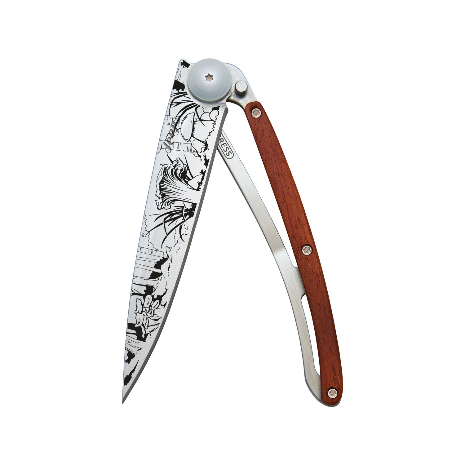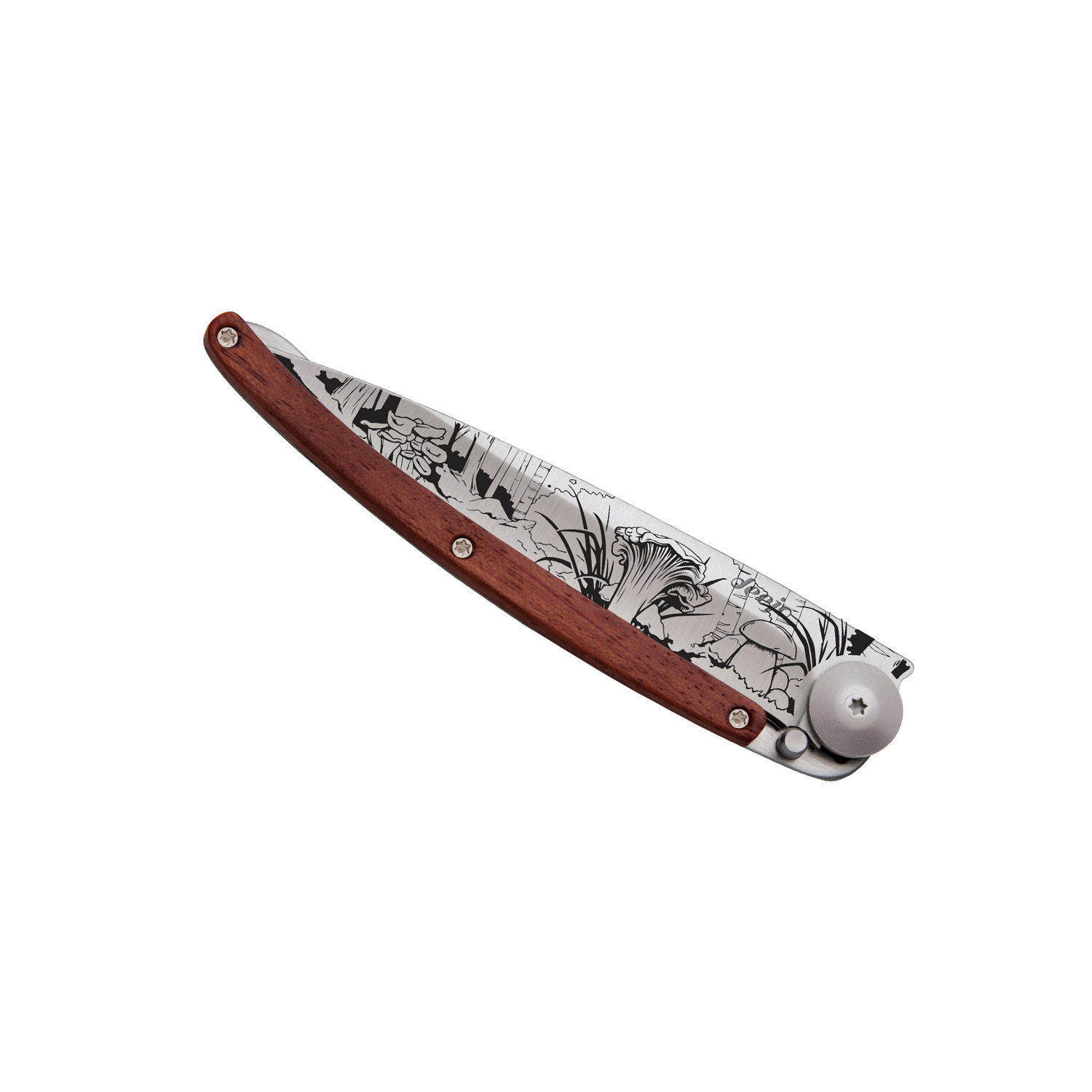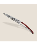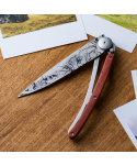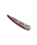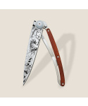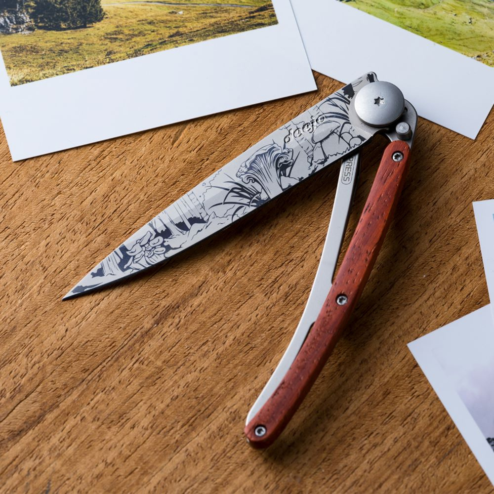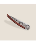 Stylový ultralehký nůž Deejo se střenkou z dřeviny coralwood a tetováním "lesních hub".