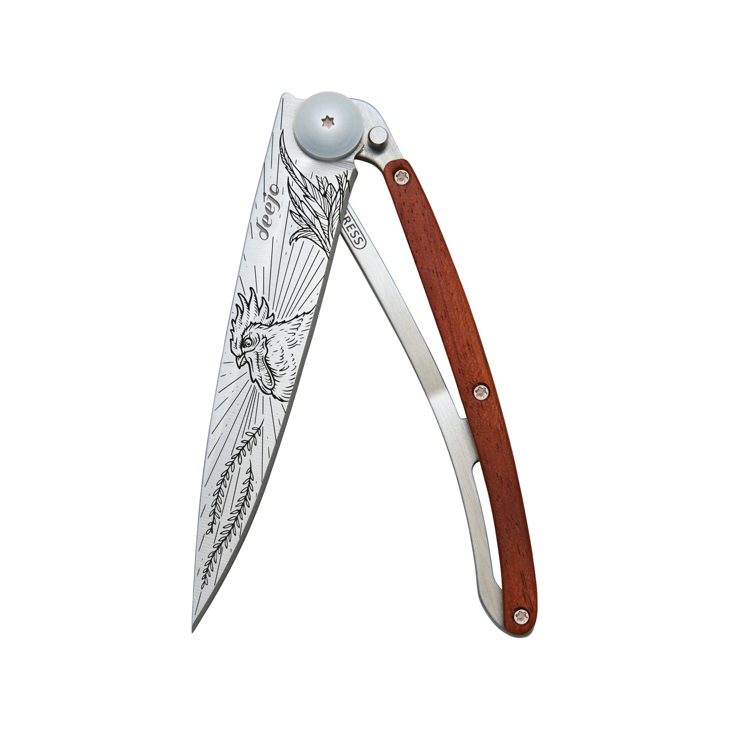 Stylový ultralehký nůž Deejo se střenkou z dřeviny coralwood a motivem kohouta.Více