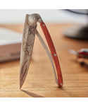 Stylový ultralehký nůž Deejo se střenkou z dřeviny coralwood a motivem kohouta.