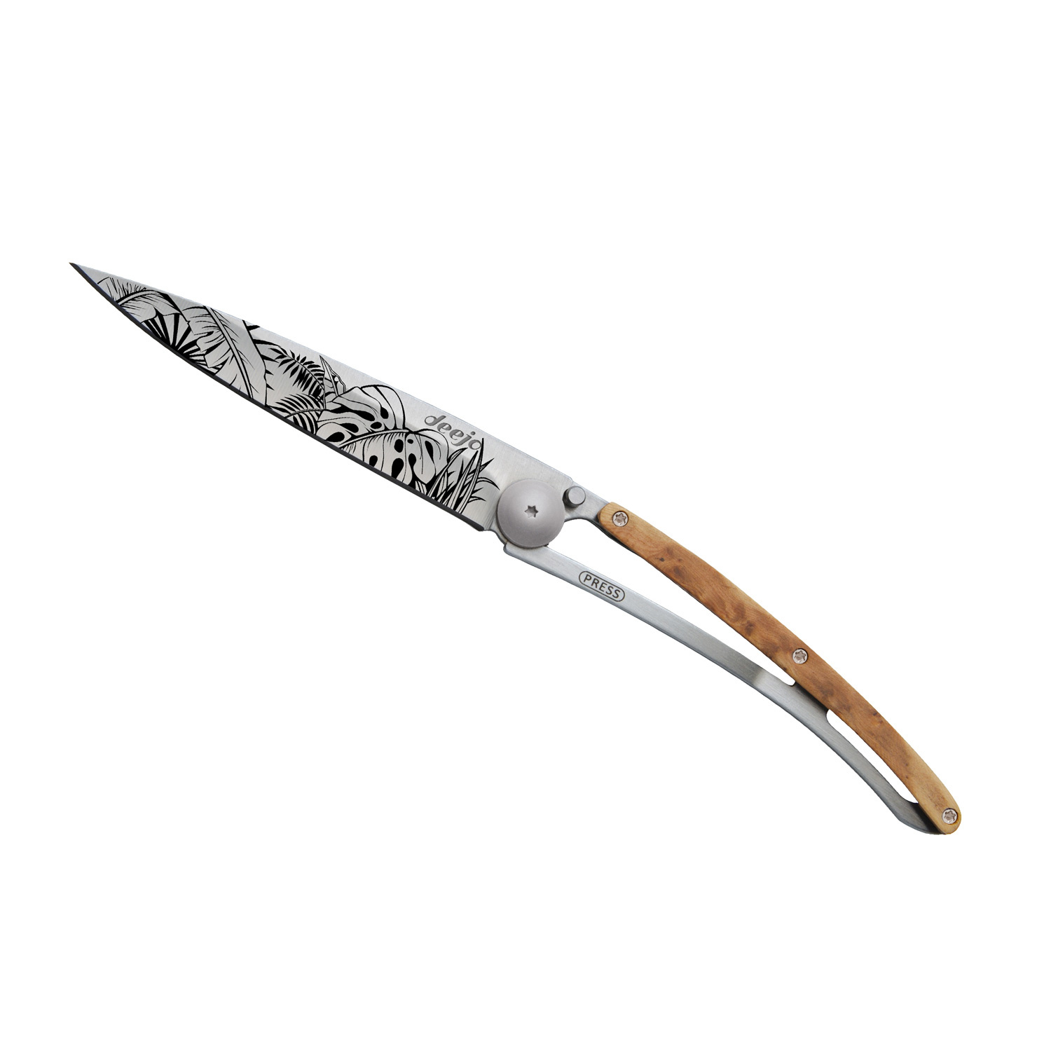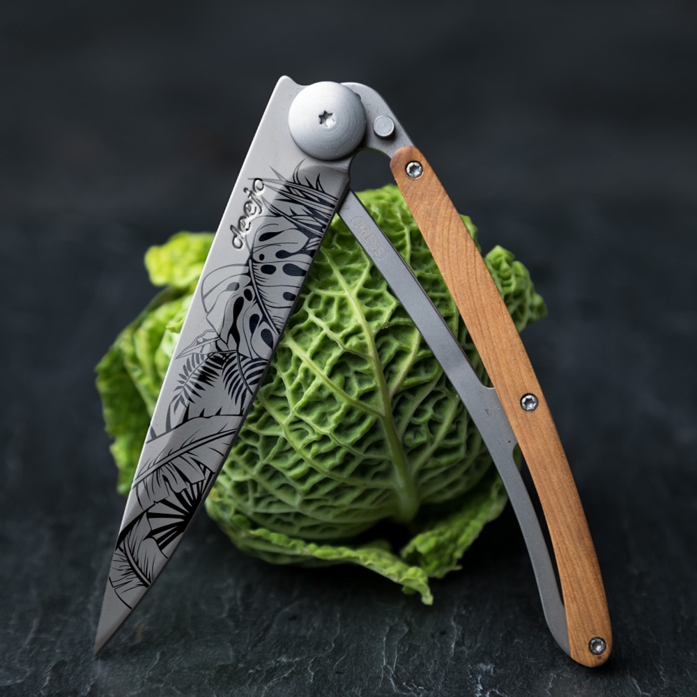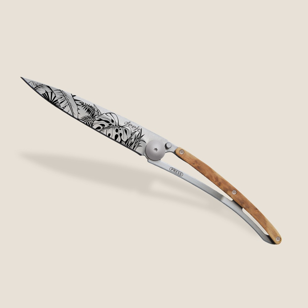 Stylový ultralehký nůž Deejo se střenkou z kořene exotického jalovce.