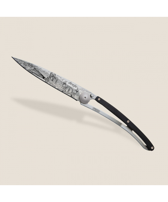 Stylový ultralehký nůž Deejo z kolekce Tattoo se střenkou z ebenového dřeva s tetováním hasič.