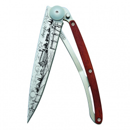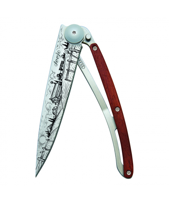 Stylový ultralehký nůž Deejo se střenkou z dřeviny coralwood a motivem farmy.Více