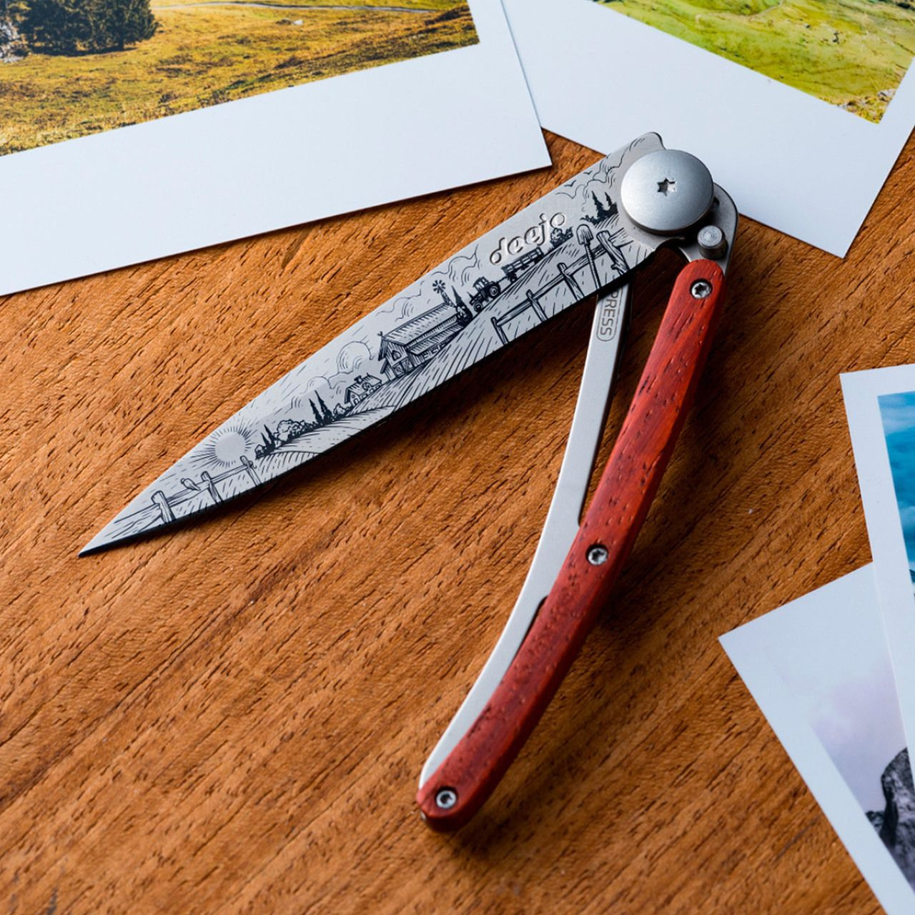 Stylový ultralehký nůž Deejo se střenkou z dřeviny coralwood a motivem farmy.