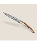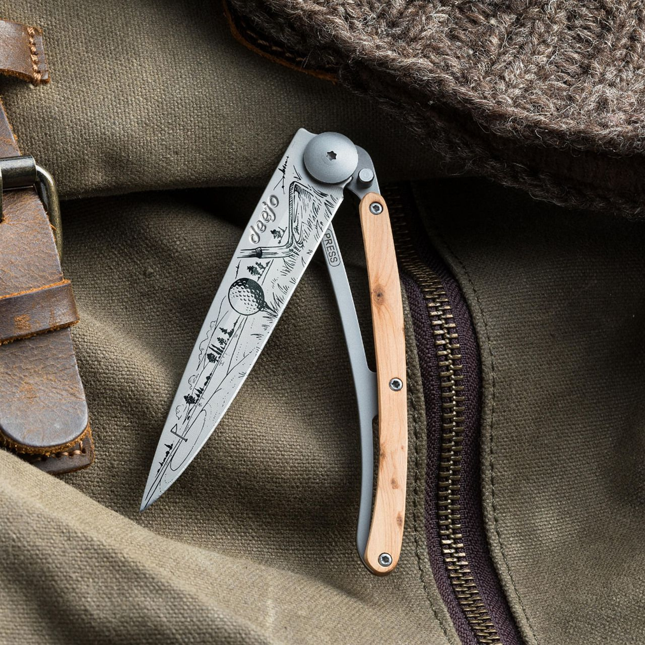 Stylový ultralehký nůž Deejo se střenkou z kořene exotického jalovce a tetováním golf.