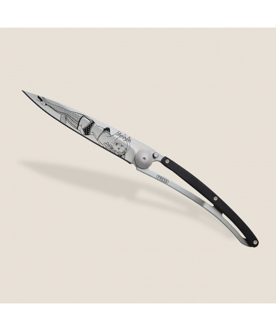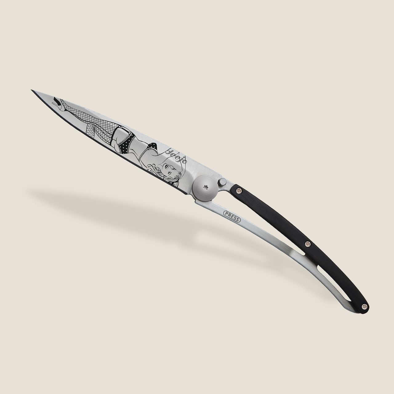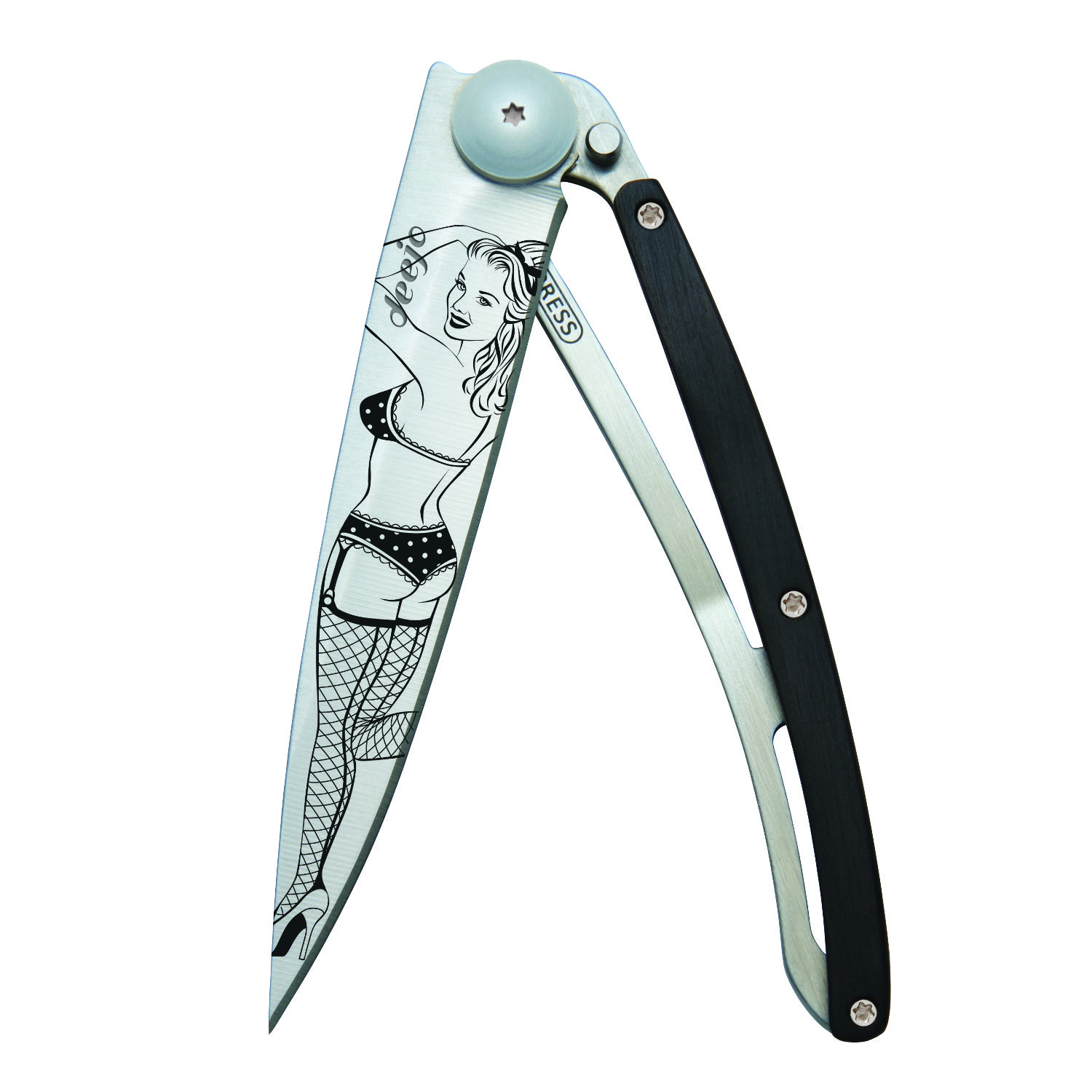 Stylový ultralehký nůž Deejo z kolekce Tattoo se střenkou z ebenového dřeva s tetováním "PinUp&
