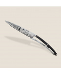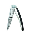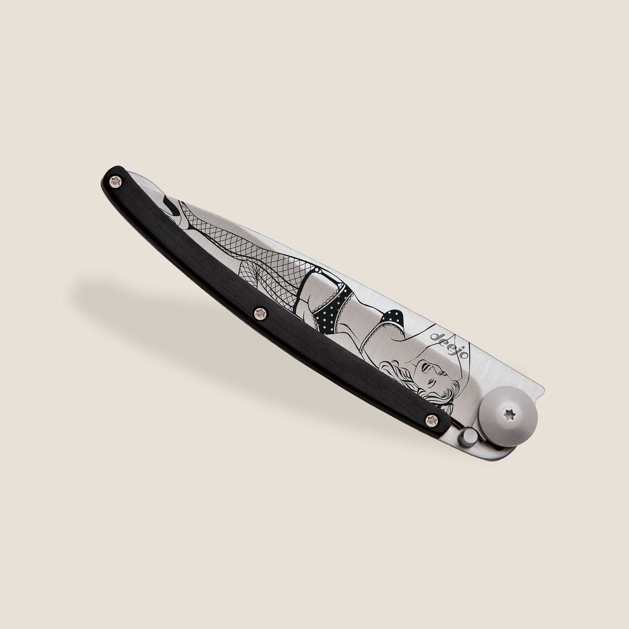 Stylový ultralehký nůž Deejo z kolekce Tattoo se střenkou z ebenového dřeva s tetováním "PinUp".